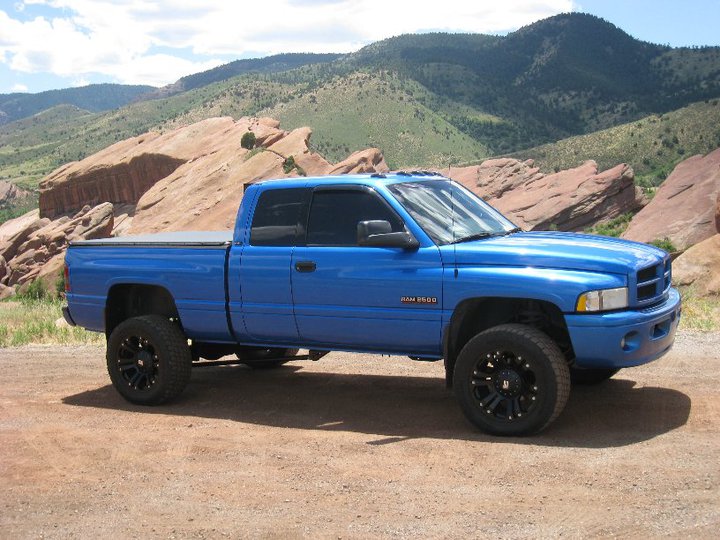 Painting of a blue Dodge Ram pickup truck parked in a mountainous landscape.