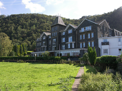 Painting of a large hotel in a wooded area, with an elderly couple walking away from it on a path.