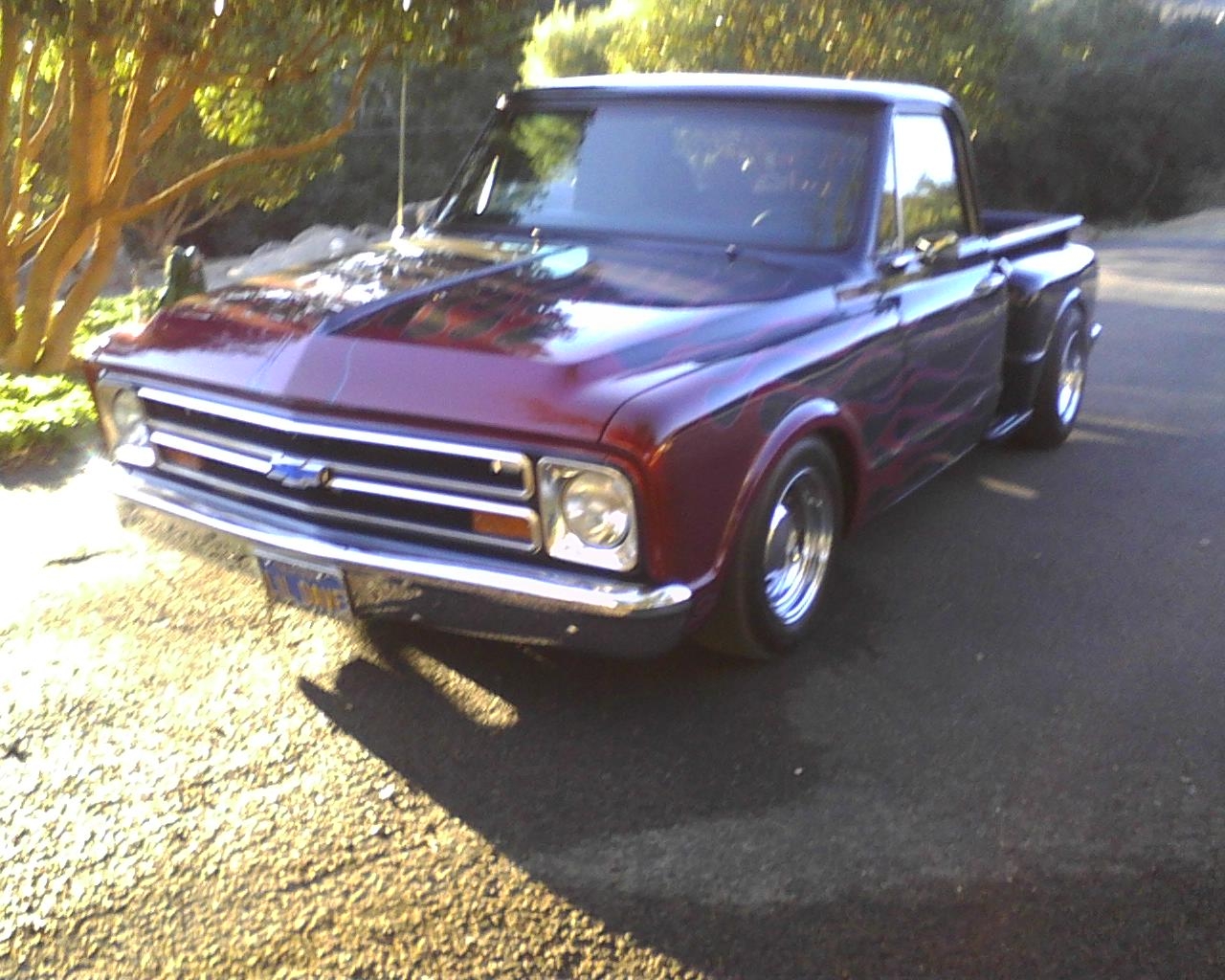 Painting of a red and black custom-painted classic Chevrolet pickup truck with flame detailing.