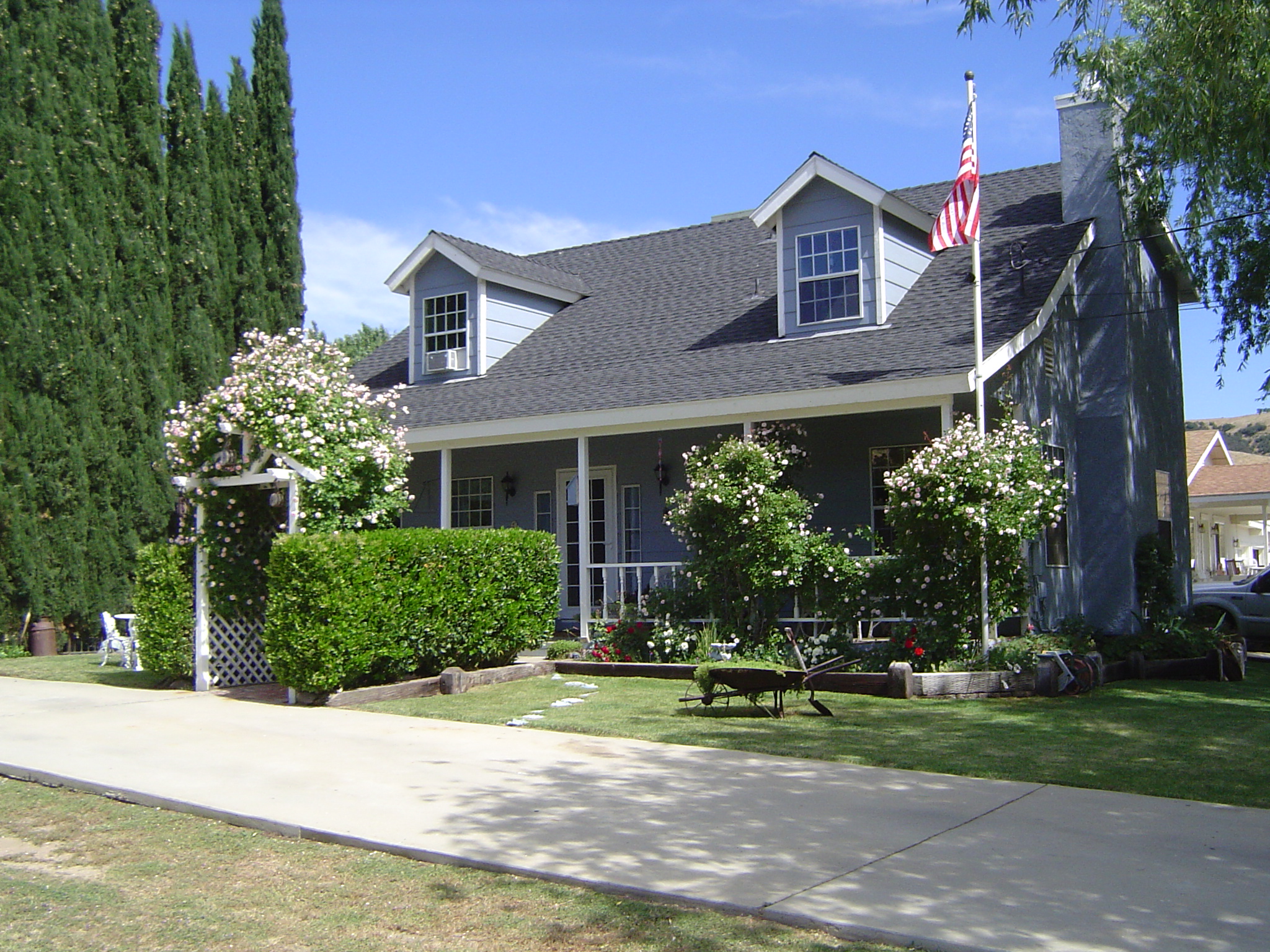 Watercolor painting of a house with an American flag, surrounded by lush greenery.