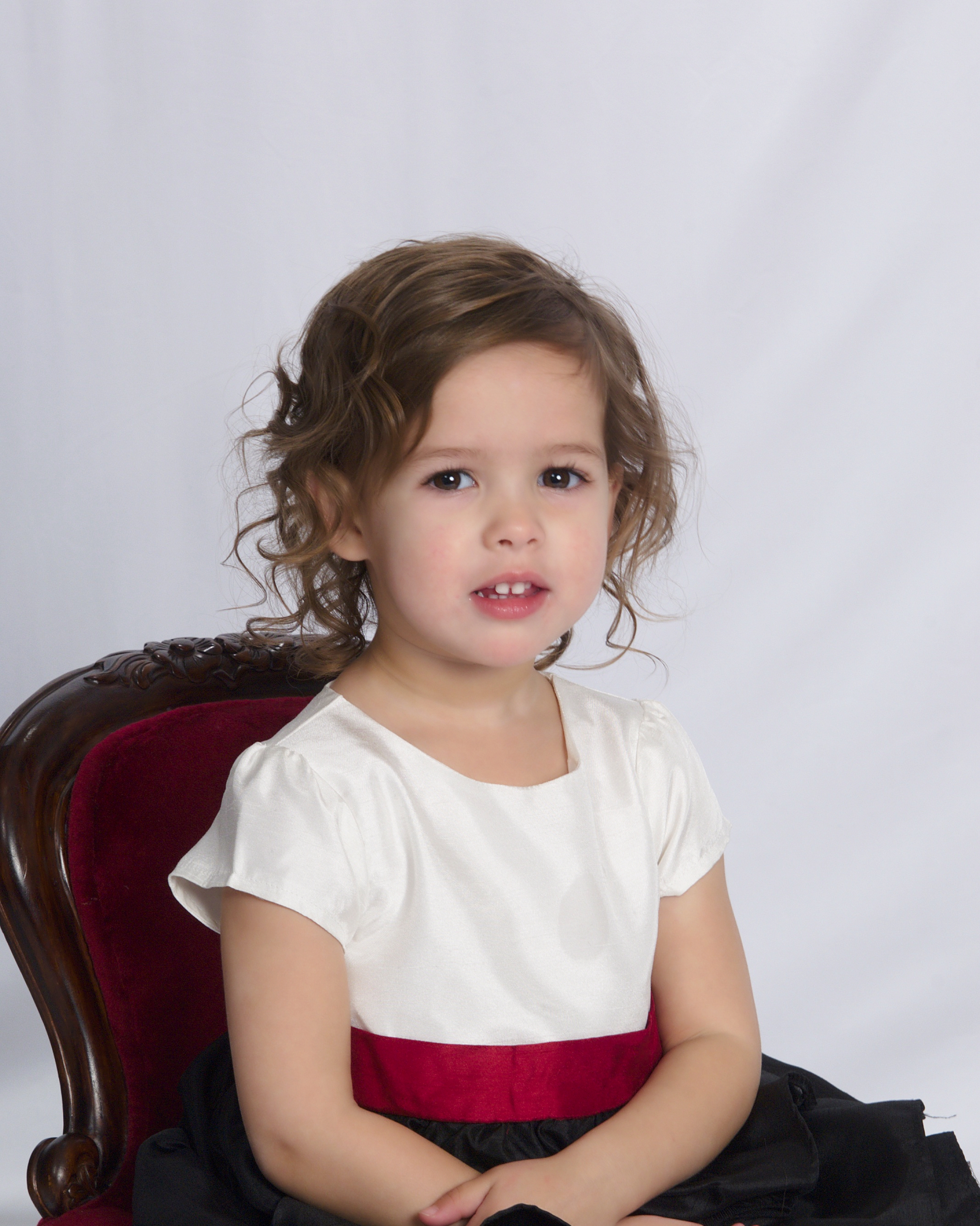 Oil painting portrait of a young girl with curly brown hair wearing a white dress with a red band.