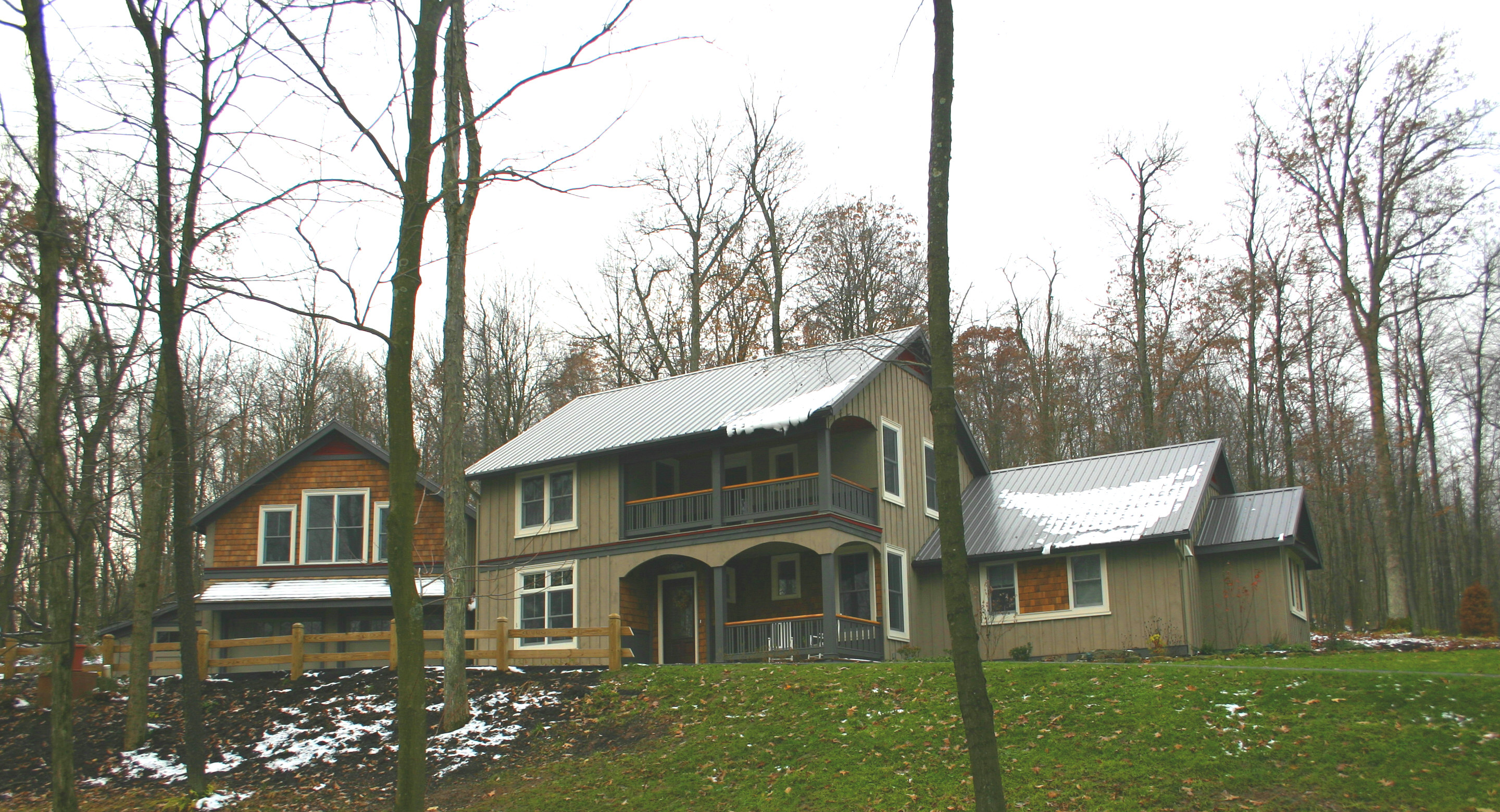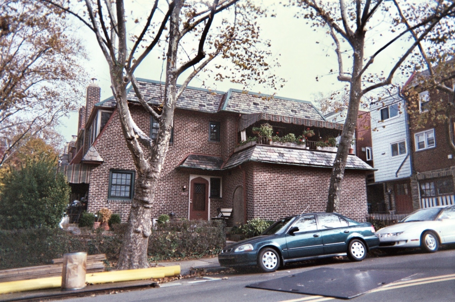 Painting of a brick house with a slate roof, trees, and a small balcony.