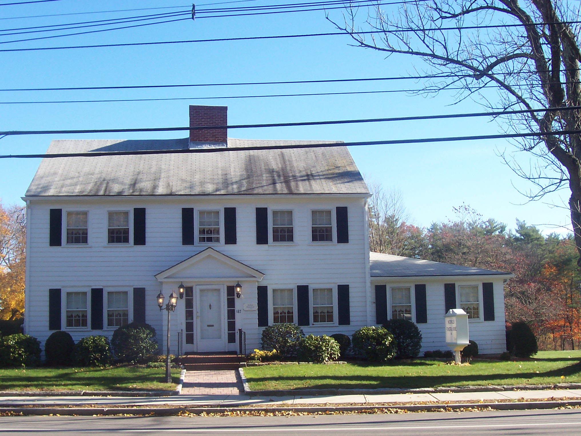 Painting of a white colonial-style house with black shutters, a brick chimney, and a sign that reads Nicholls Funeral Home.