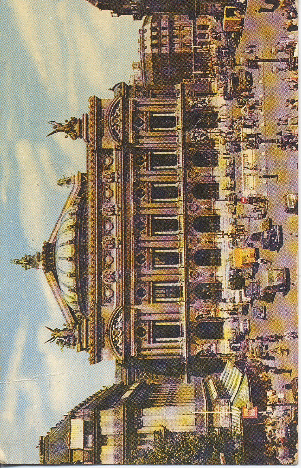 Painting of the Palais Garnier in Paris with people and cars in the square.
