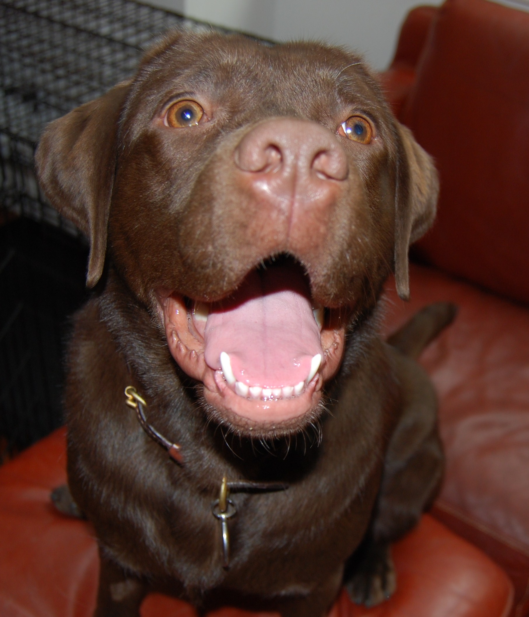 Painting of a chocolate Labrador Retriever with its mouth open, wearing a collar with a key attached.