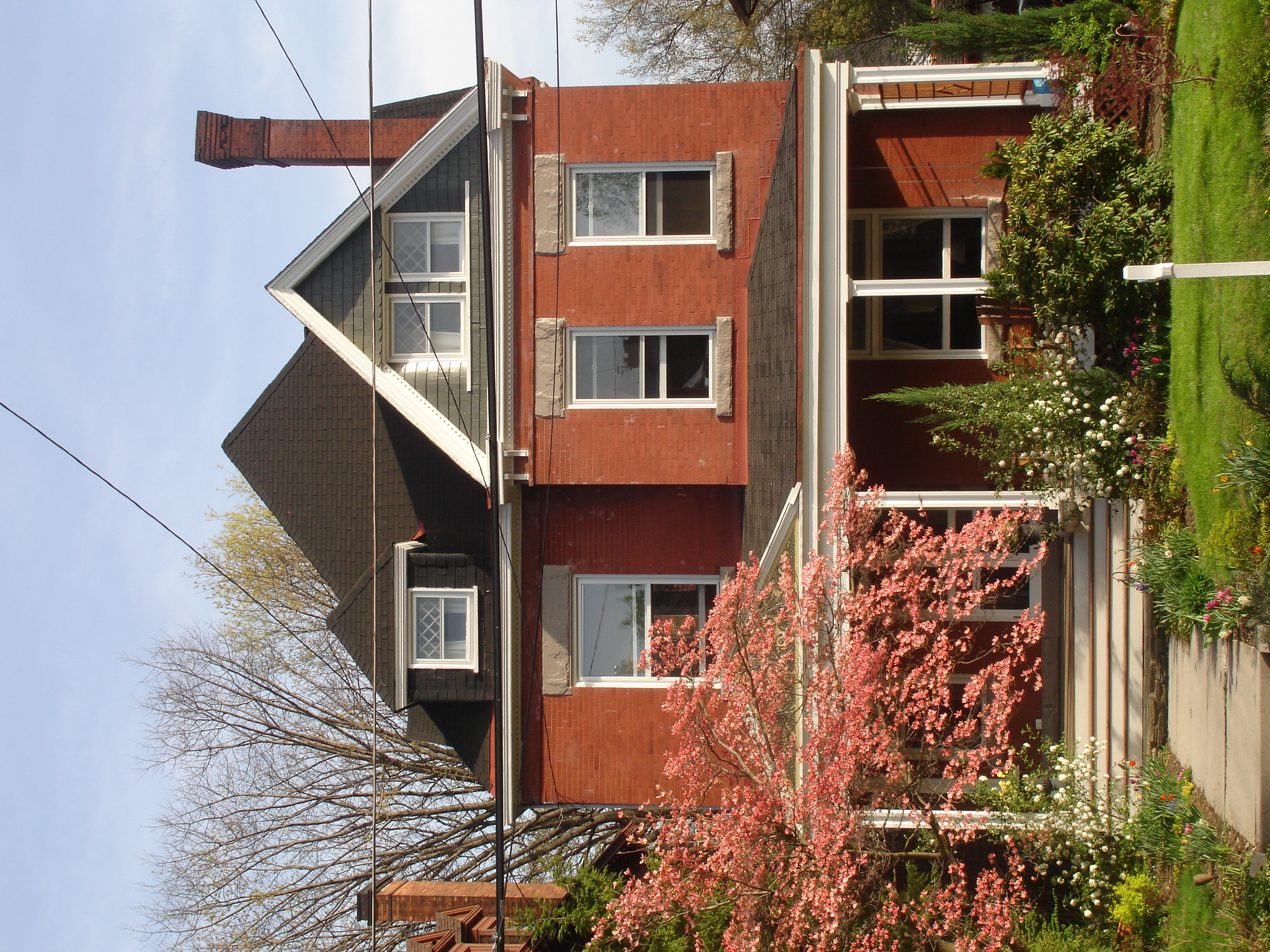 Painting of a brick house with a flowering tree and porch.