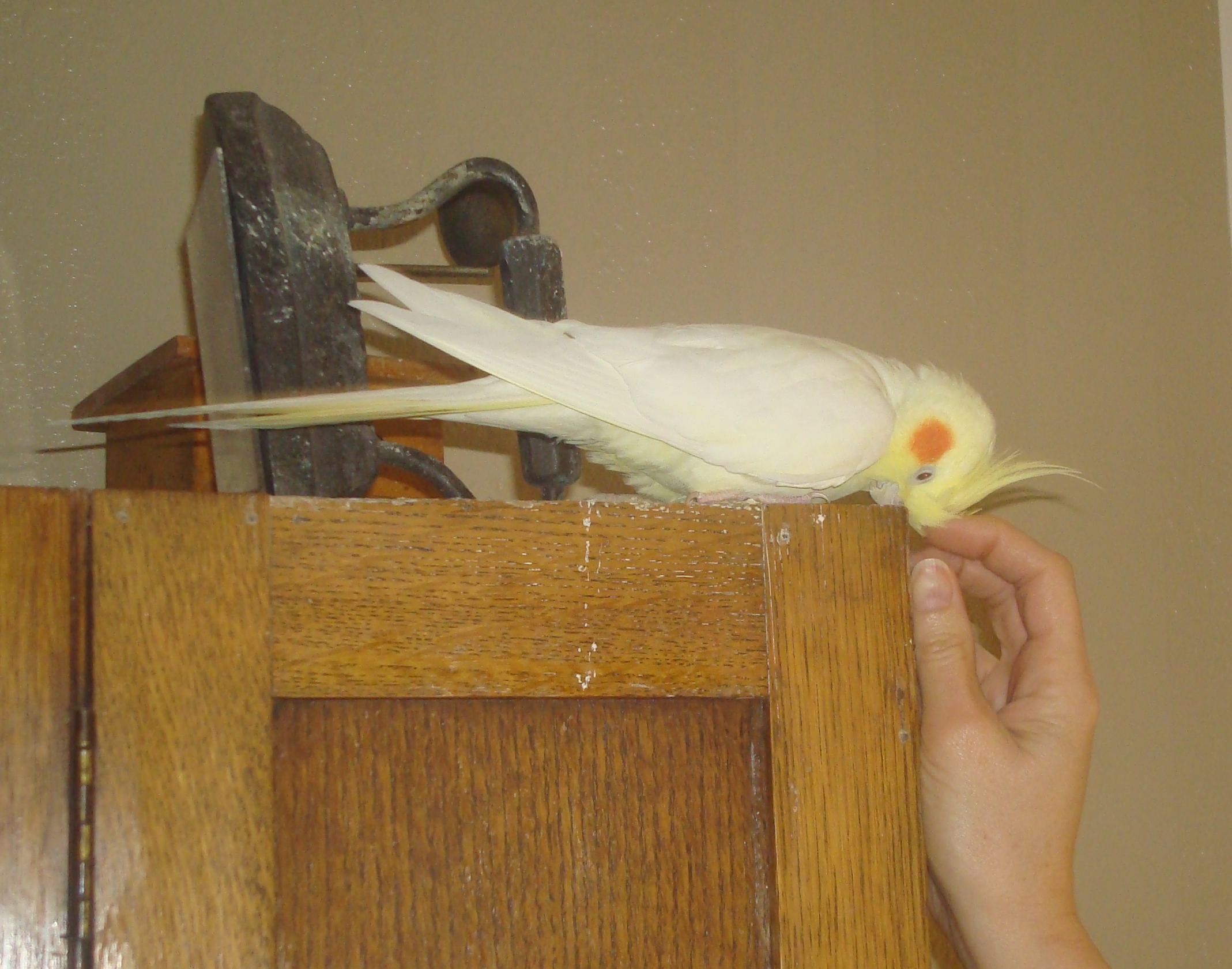 Painting of a white cockatiel perched on a wooden cabinet, being petted by a hand.