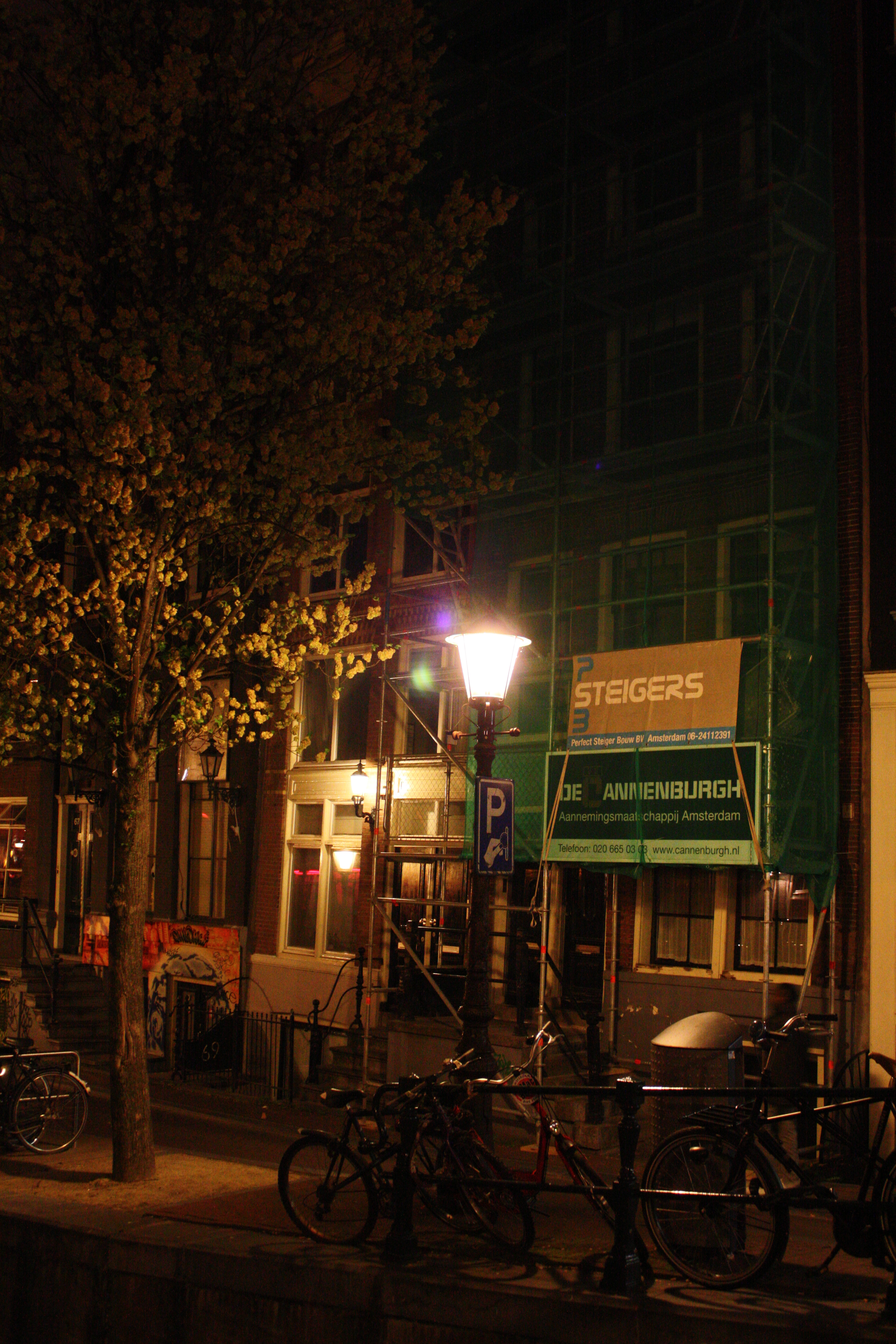 Night scene of Amsterdam street with scaffolding, bicycles, and tree.