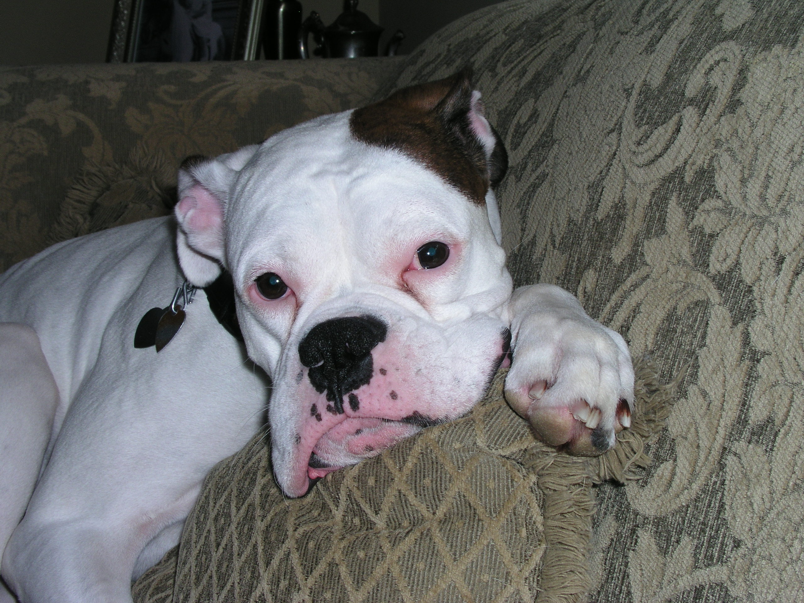 Pencil sketch of a Boxer dog resting its head and paw on a textured surface.