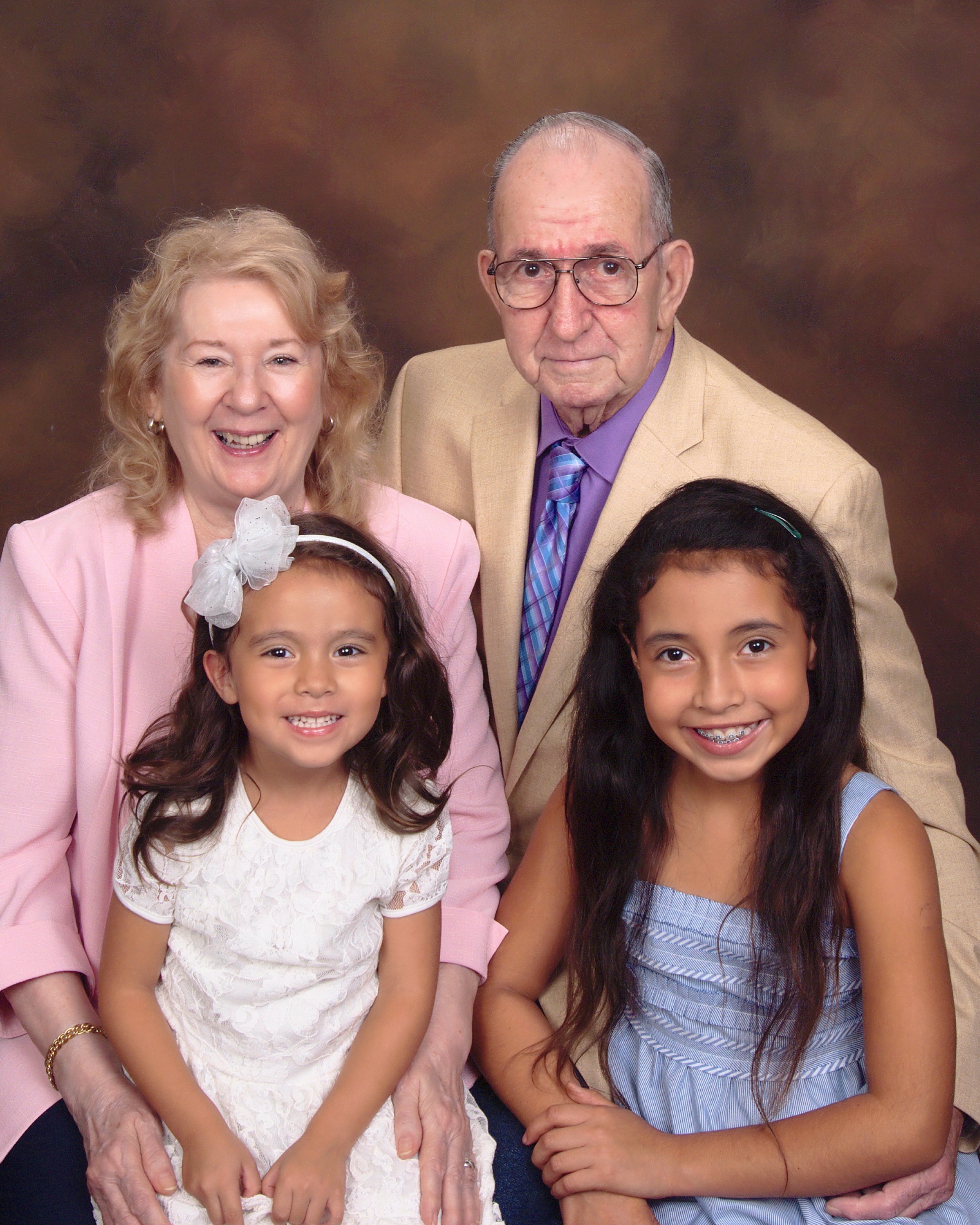 Family portrait painting: grandparents, mother, and two granddaughters.