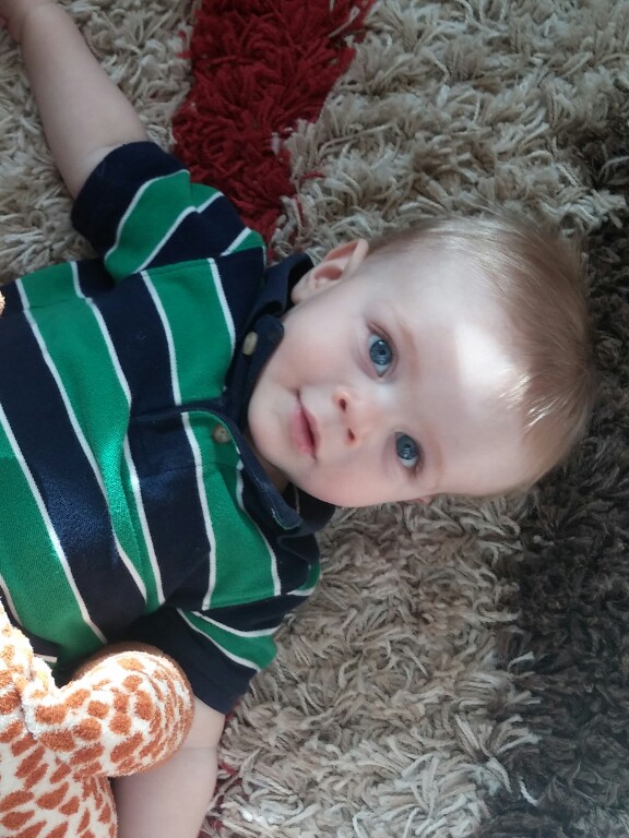 Portrait painting of a toddler with blond hair and blue eyes, wearing a green and navy striped shirt.