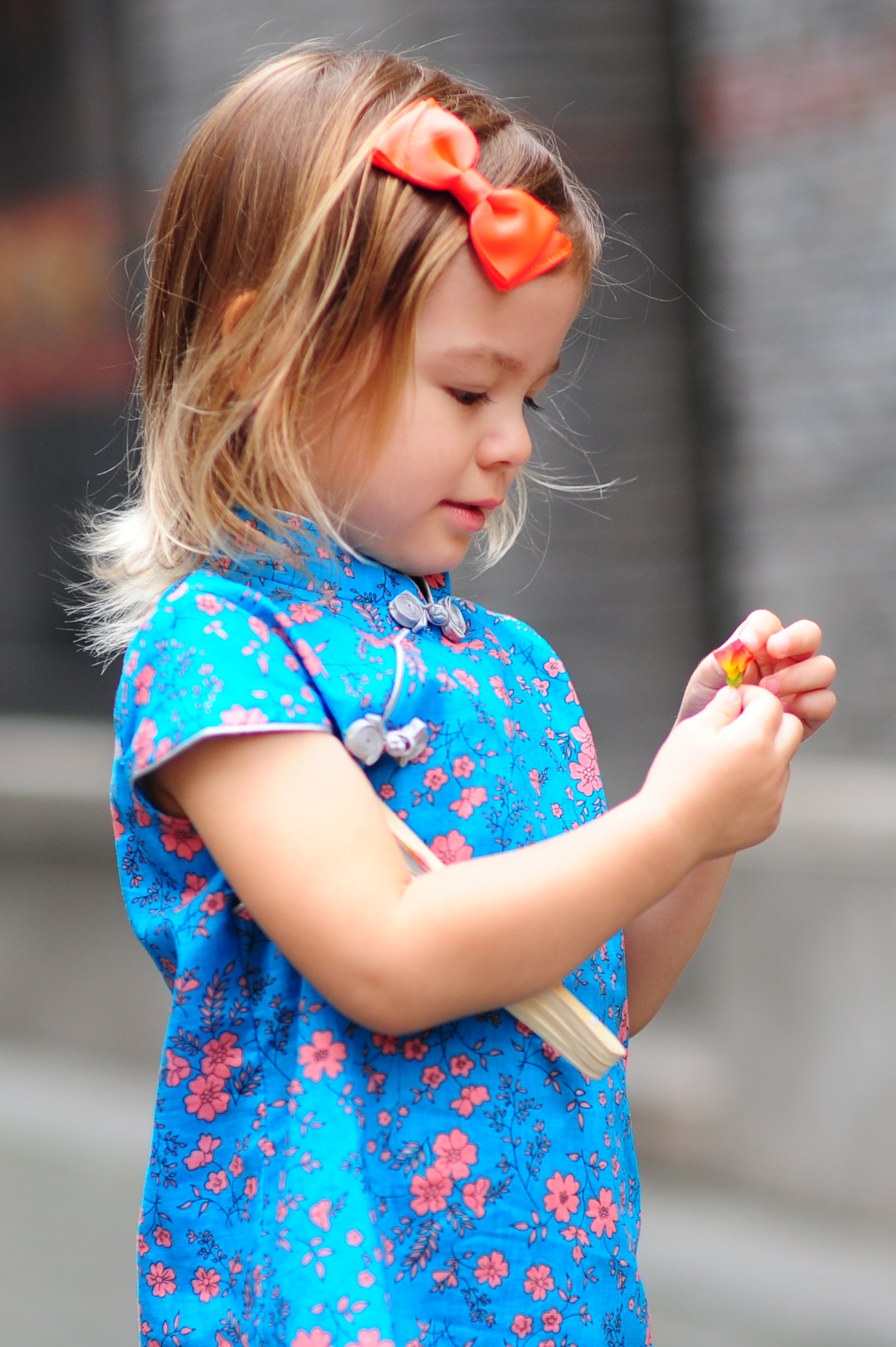 Portrait of a toddler girl in a blue floral dress holding a small flower.
