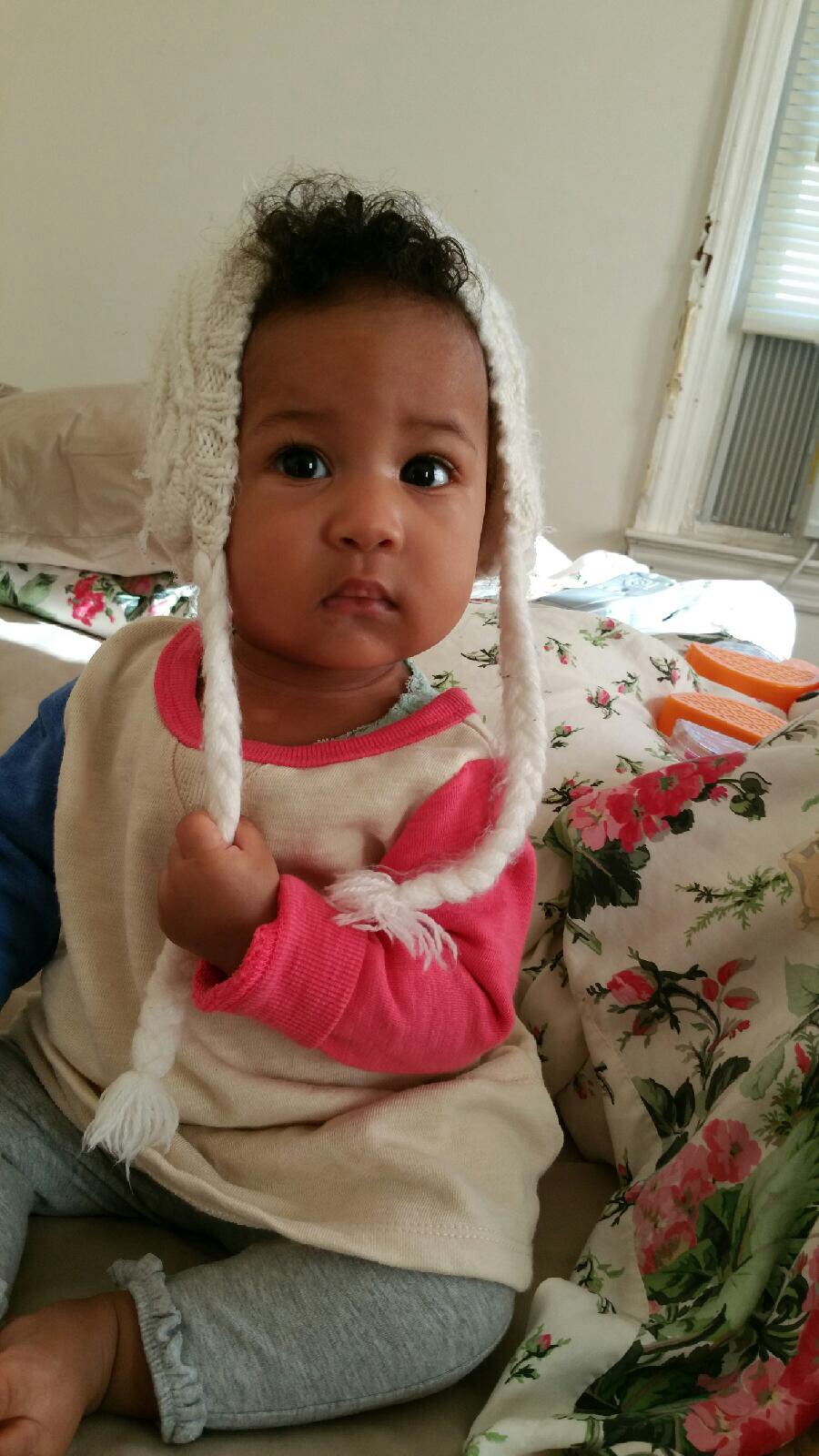 Portrait painting of a toddler in a white knit hat.