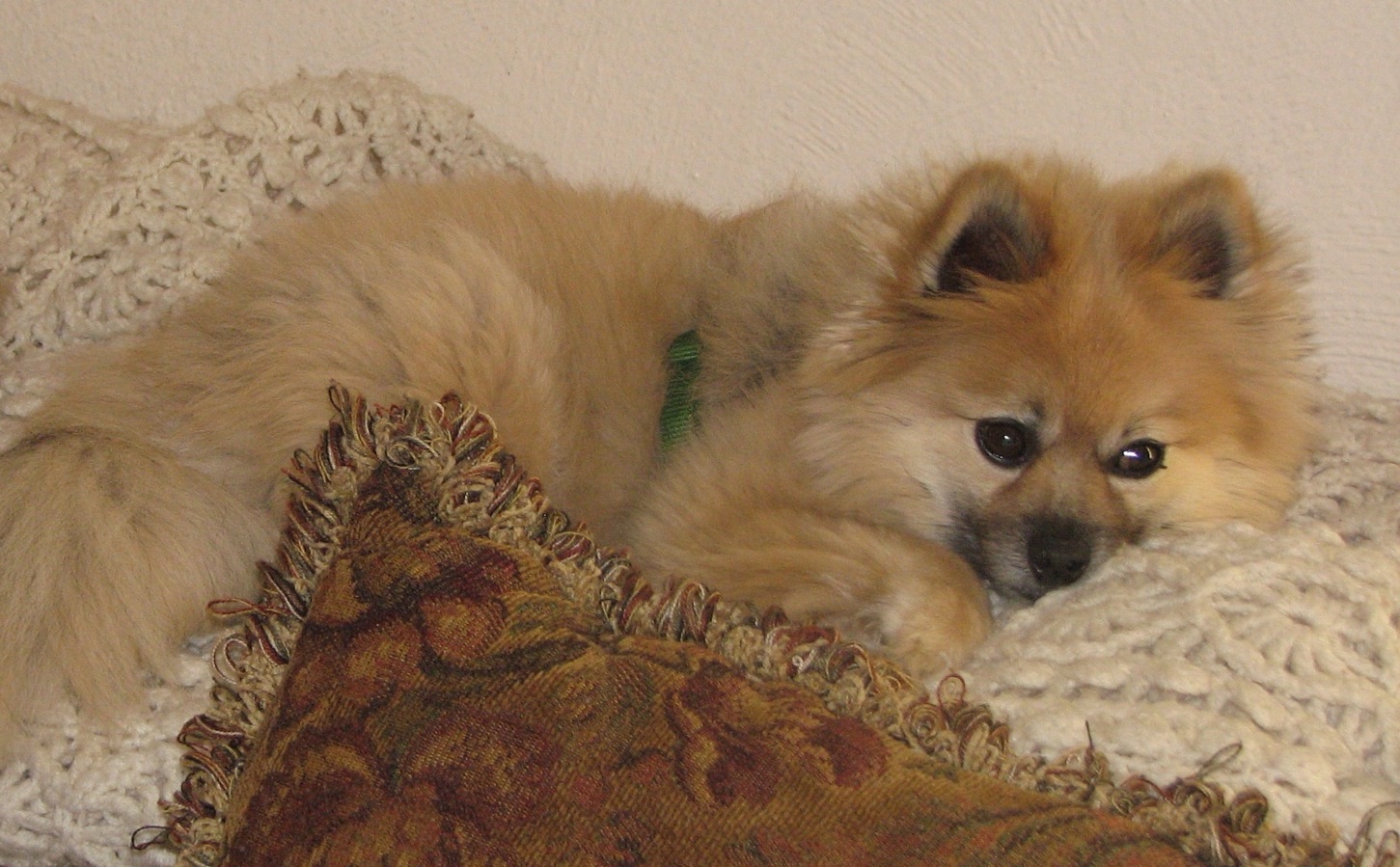 Painting of a Pomeranian dog lying on red and brown pillows.