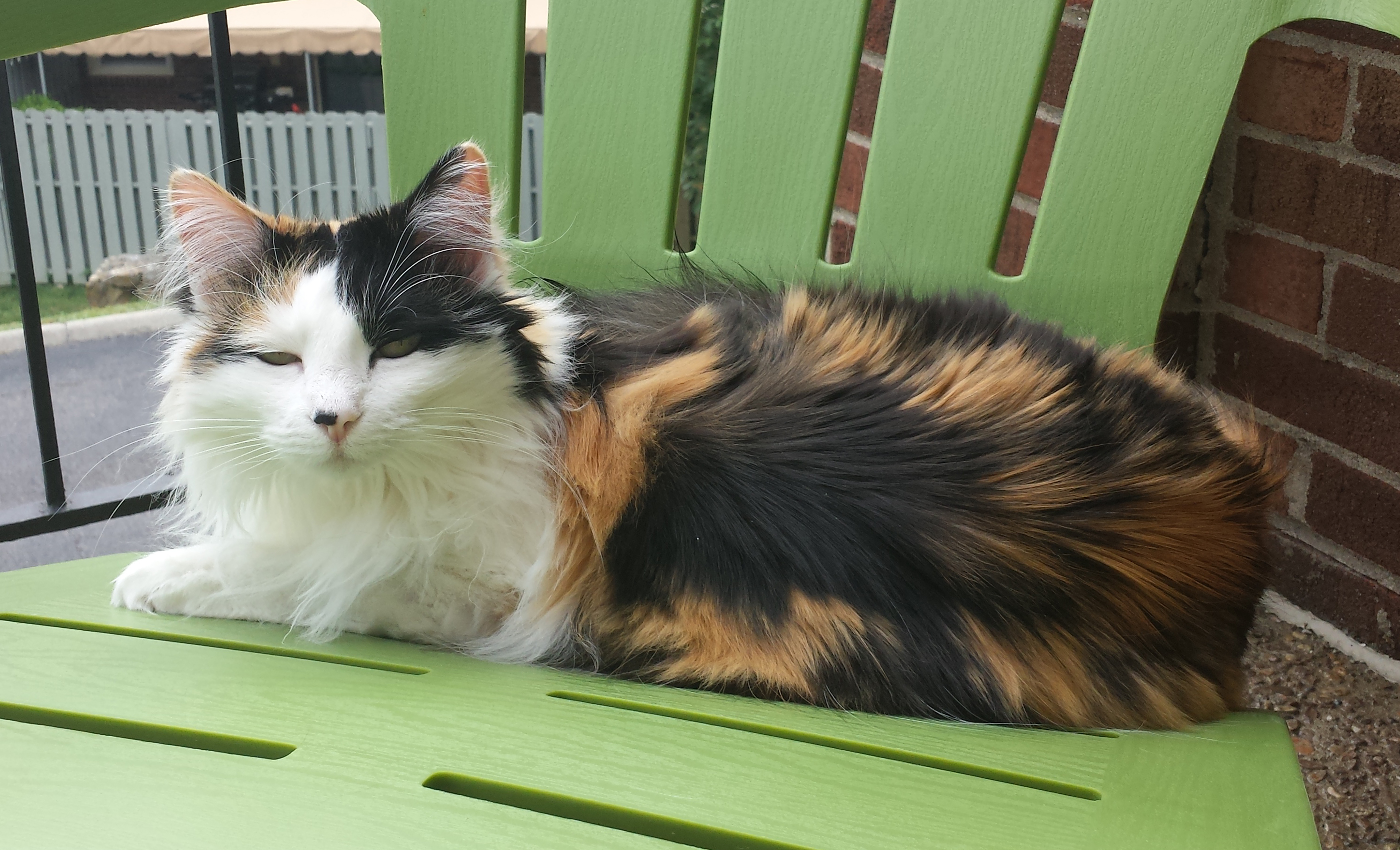 Calico cat resting on a green chair.