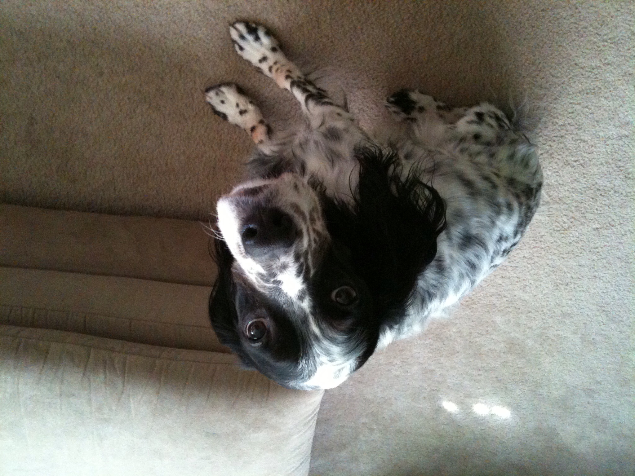 Painting of a black and white English Setter dog sitting and looking up.
