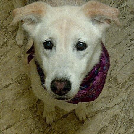 Painting of a white dog with blue eyes wearing a red bandana.