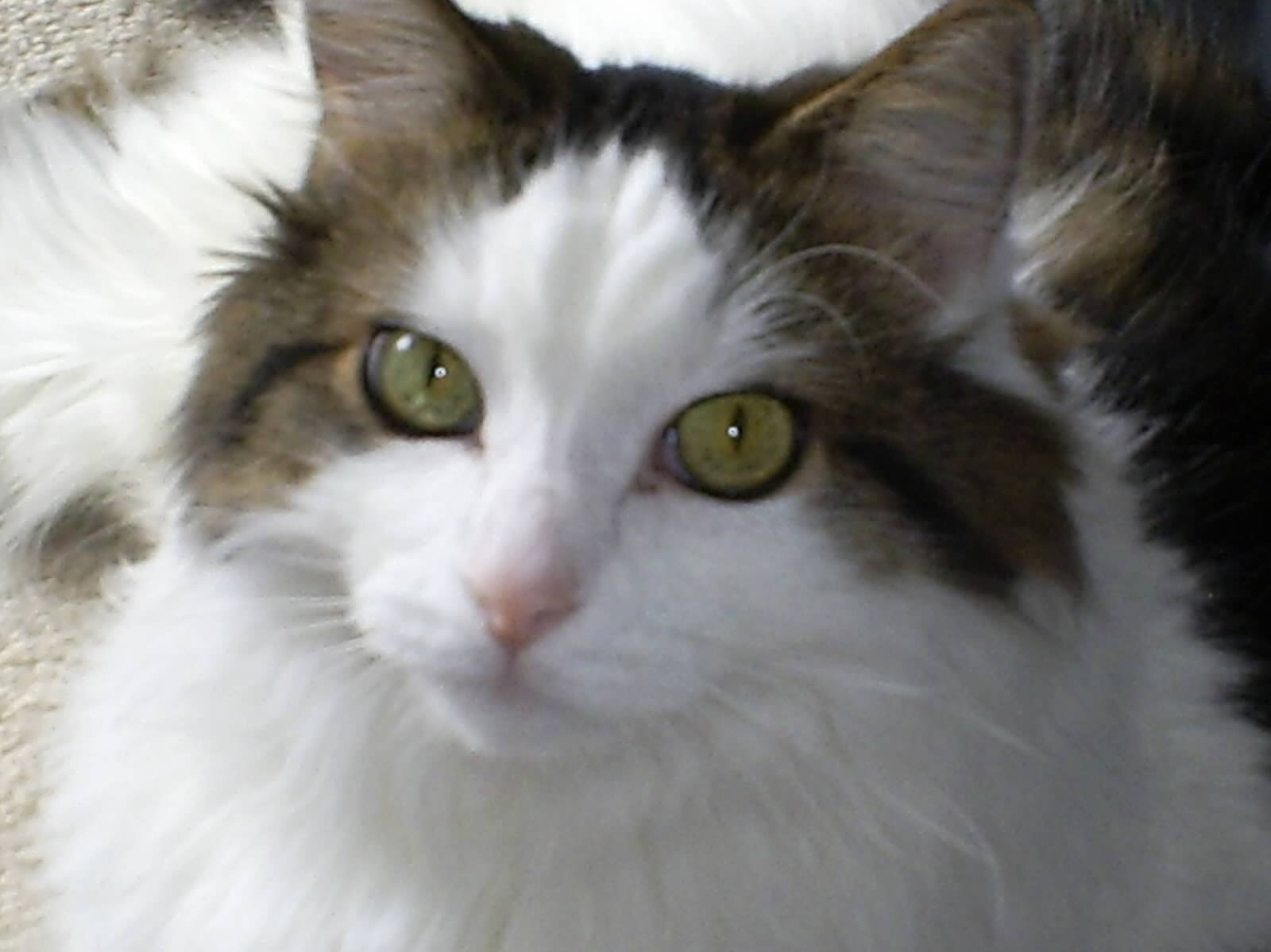 Painting of a calico cat with green eyes