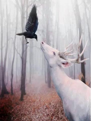 Painting of a white deer with large antlers looking up at a black crow in a misty forest.