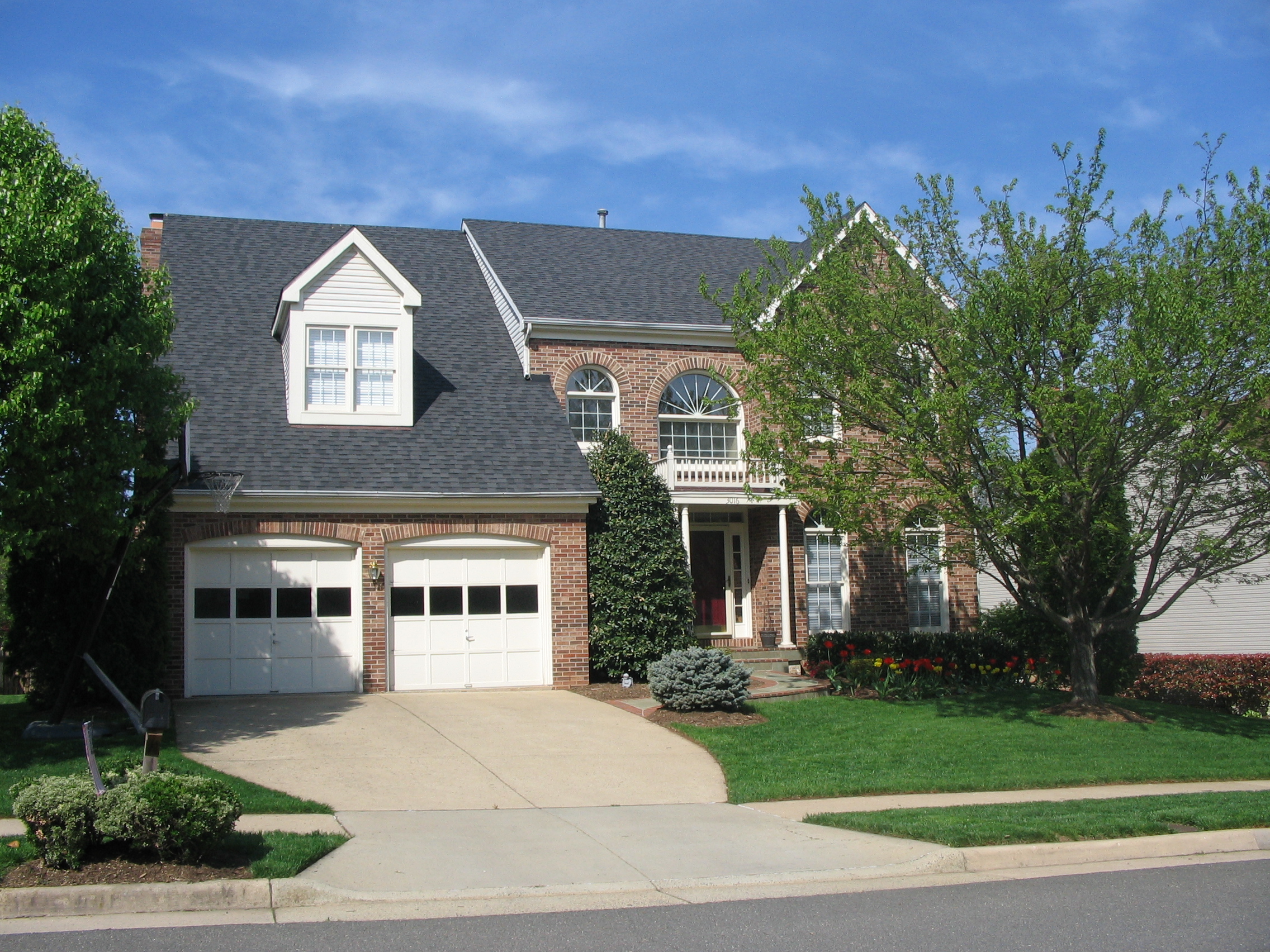 Painting of a two-story brick house with a two-car garage and landscaping.