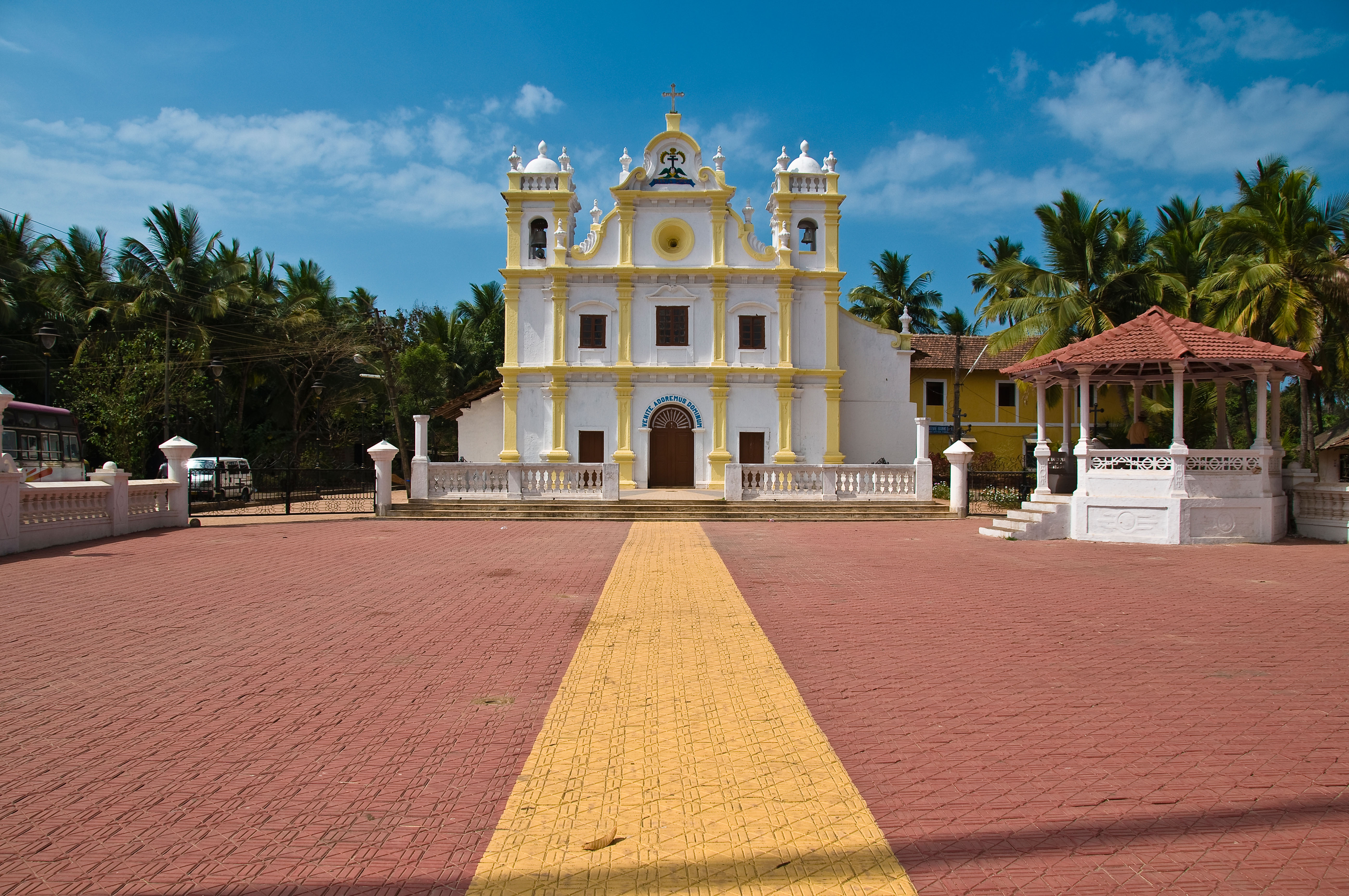 Painting of a white church with yellow trim, a red-pink plaza, and a gazebo under a blue sky.