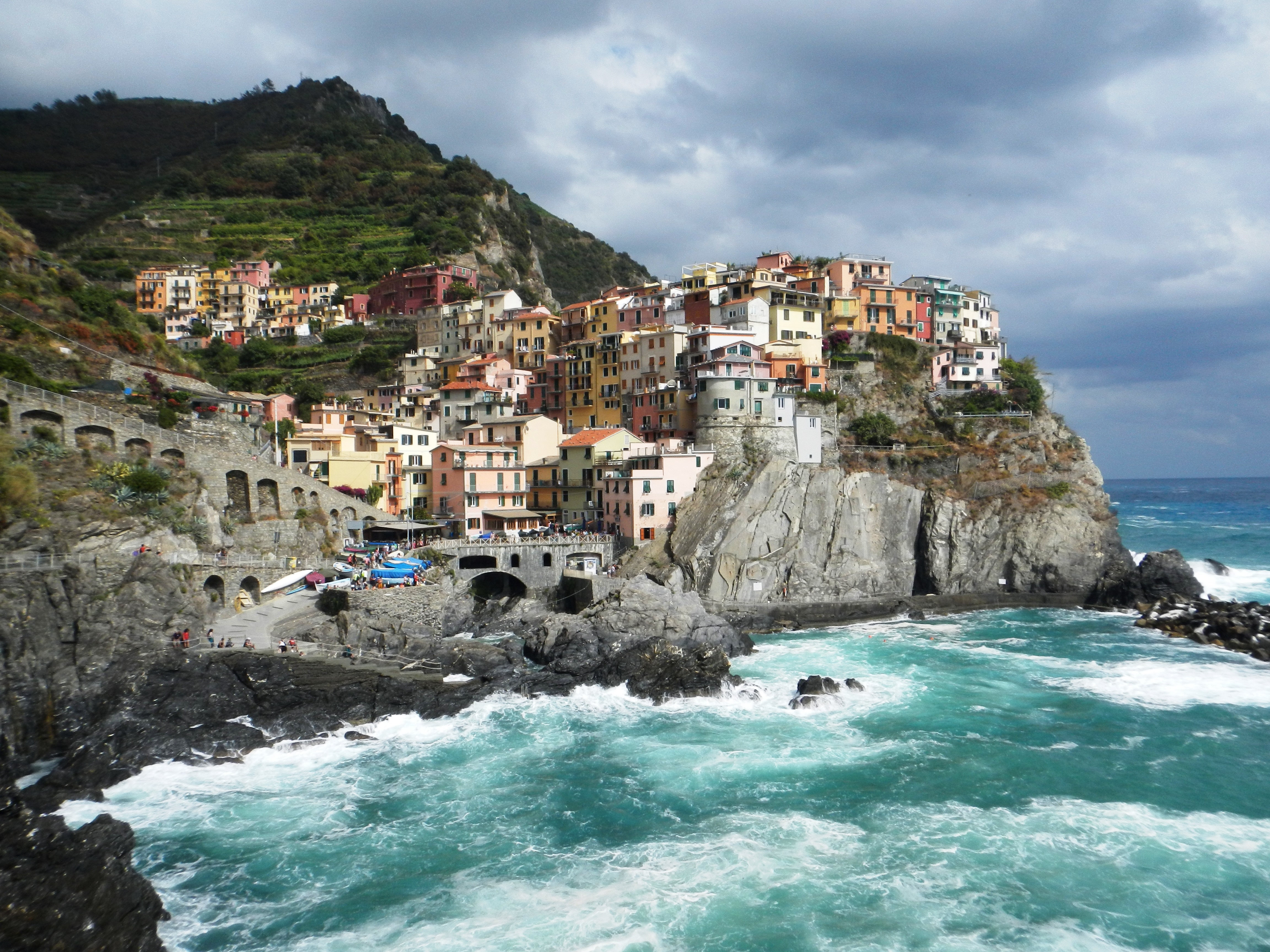Painting of colorful houses on a cliffside overlooking a turbulent sea.