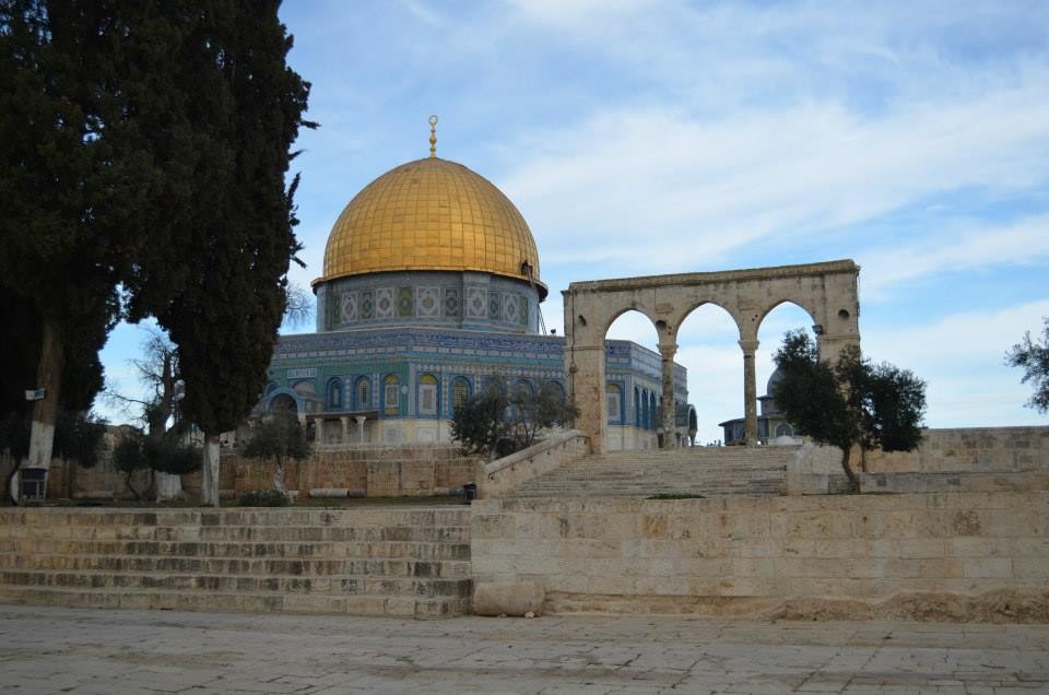 Painting of the Dome of the Rock with stone stairs and arches in the foreground.