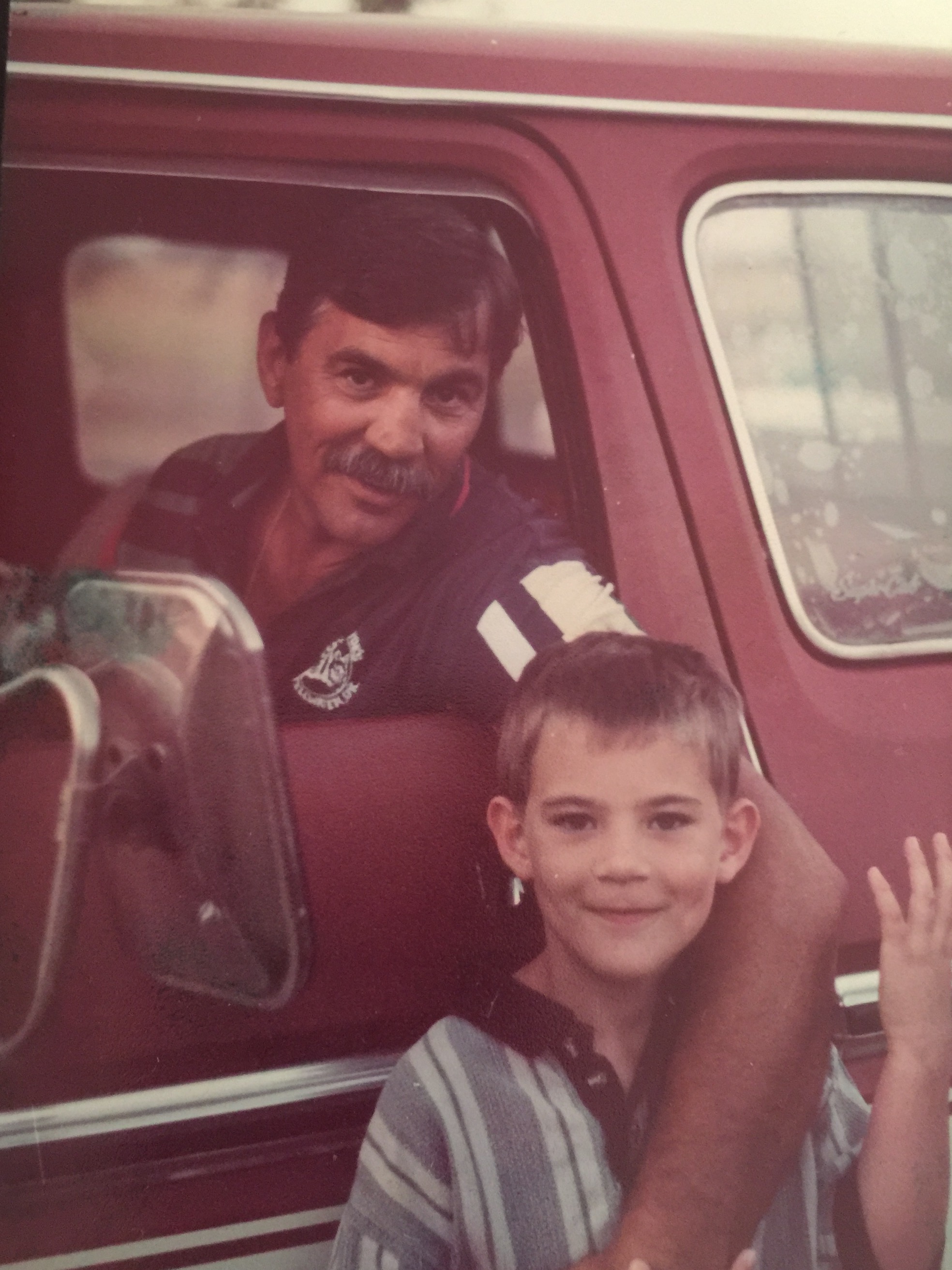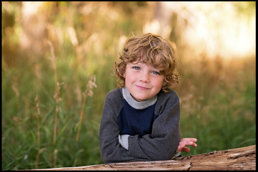 Portrait of a smiling boy with curly red hair, wearing a dark blue sweater.