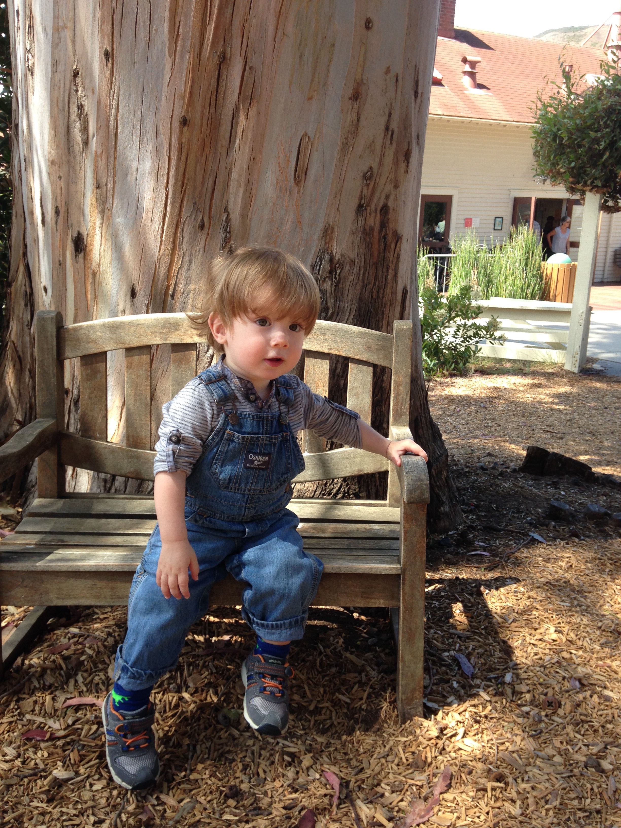 Portrait of toddler in overalls sitting on a wooden bench