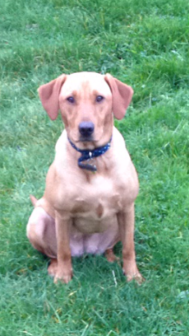 Painting of a light brown Labrador Retriever sitting in the grass wearing a dark blue collar.