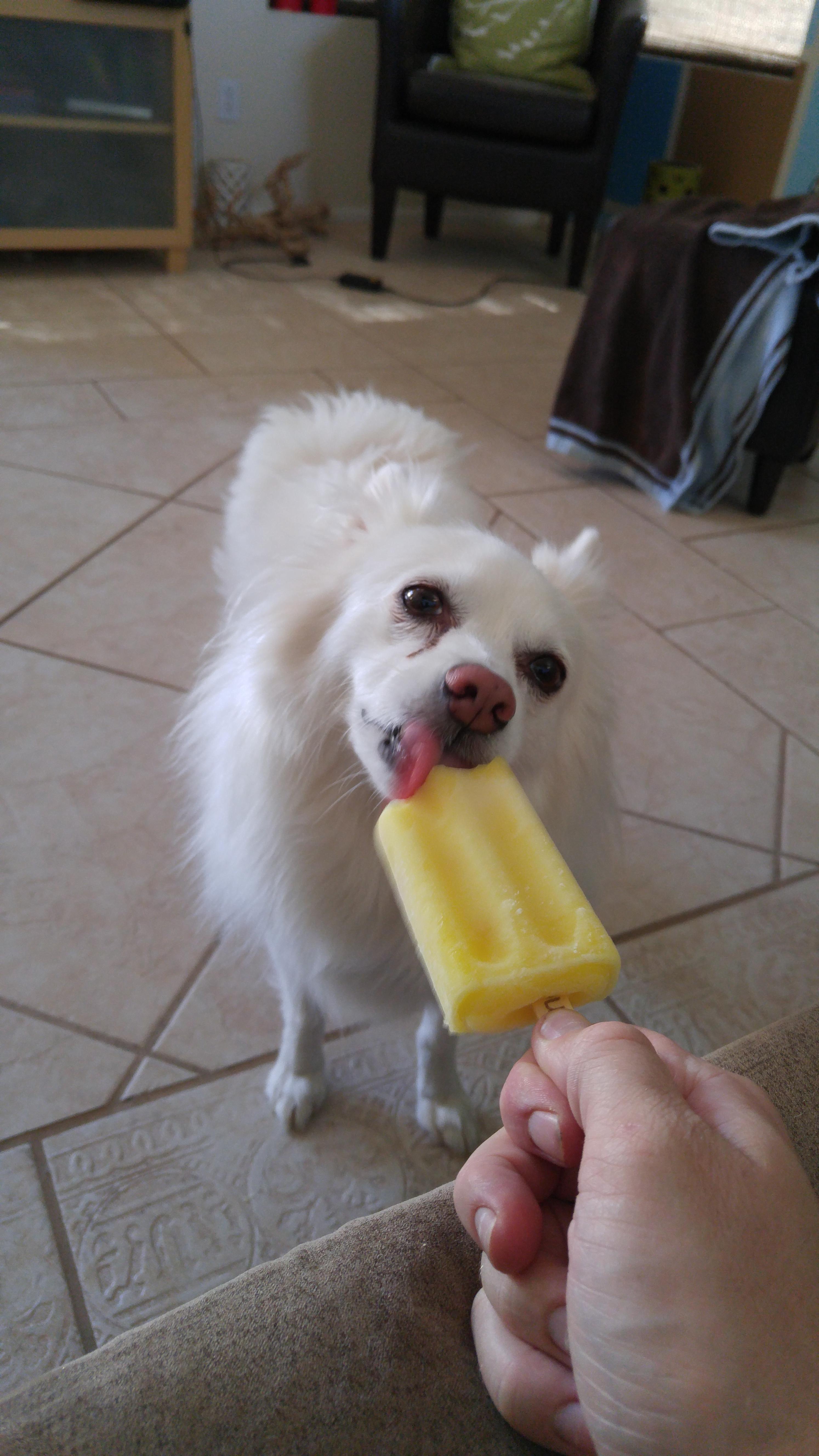 Watercolor painting of a white fluffy dog licking a yellow popsicle held by a hand.