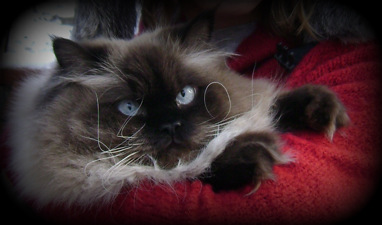 Painting of a longhaired cat with blue eyes lying on a pink surface.