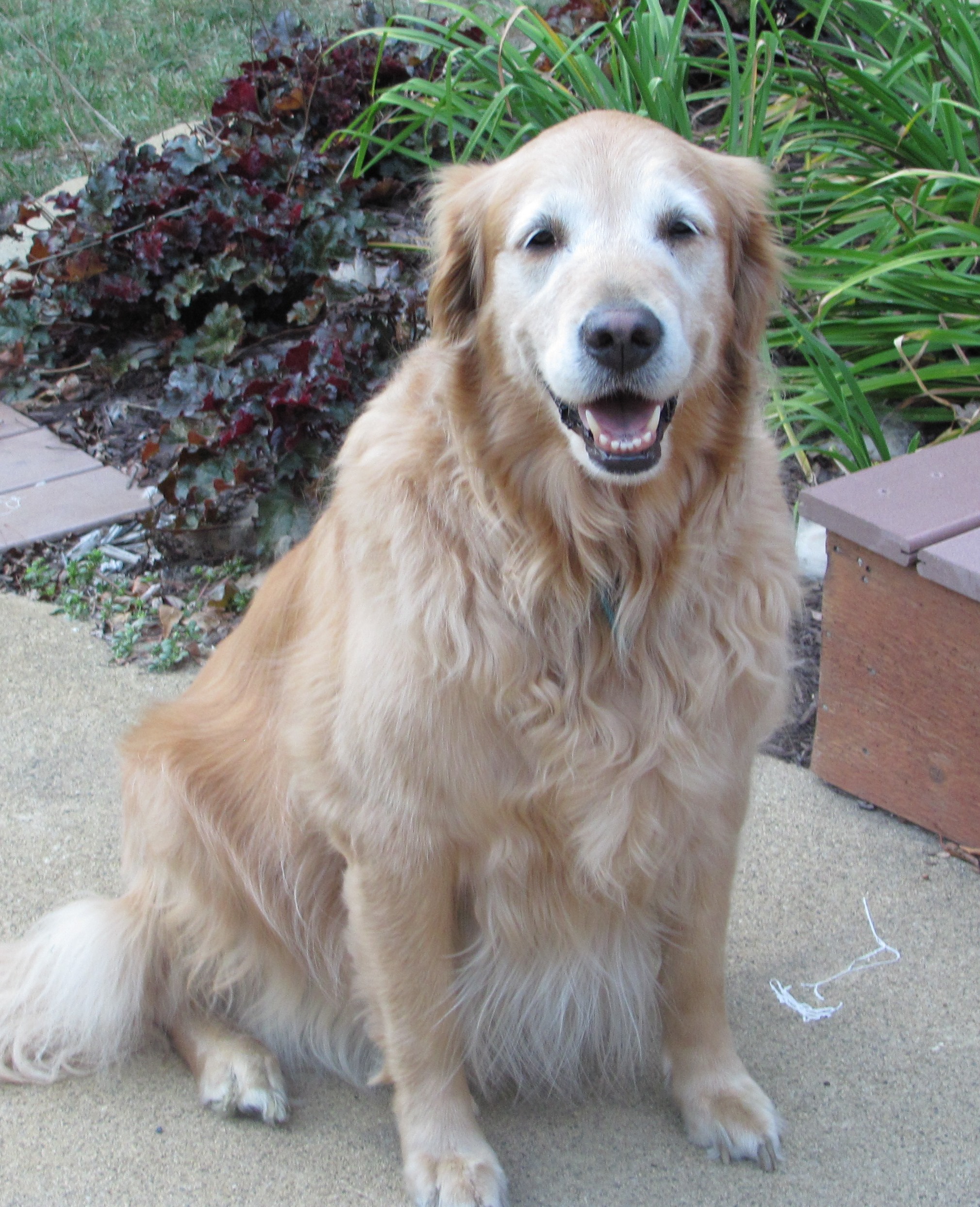 Painting of a smiling golden retriever amidst green foliage.