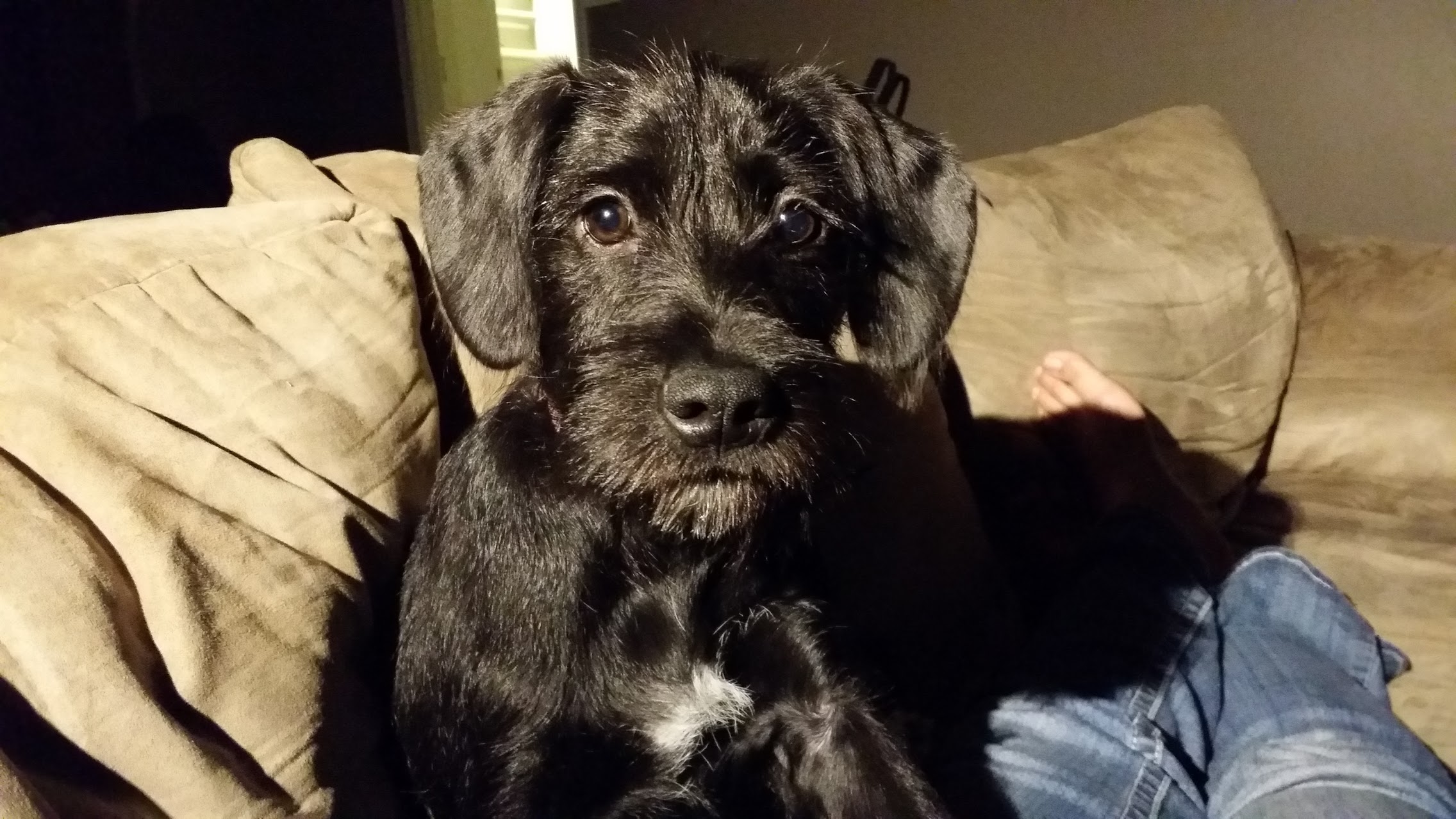 Painting of a dark brown puppy.