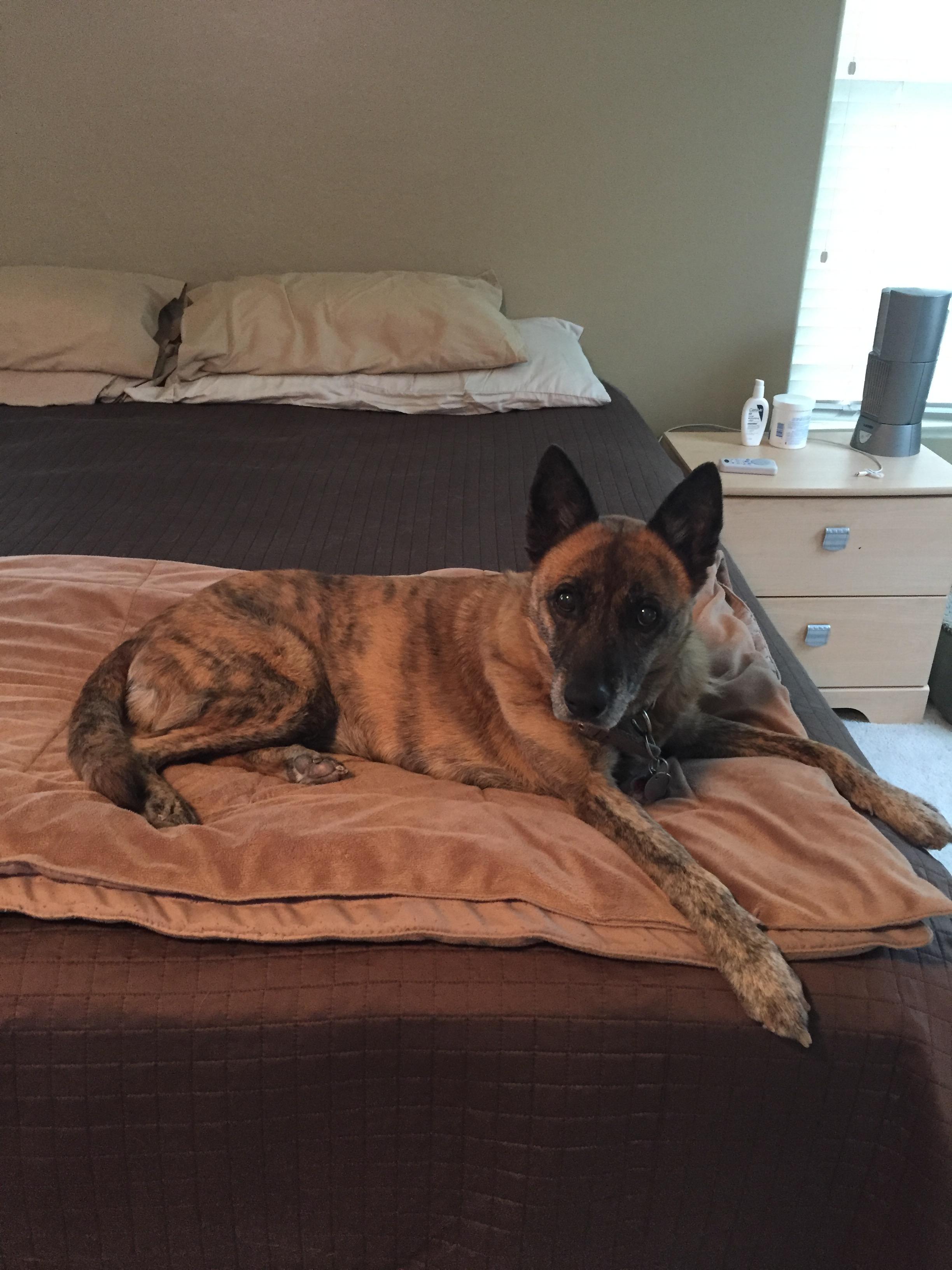 Framed colored pencil drawing of a Belgian Malinois lying on a peach-colored pillow.