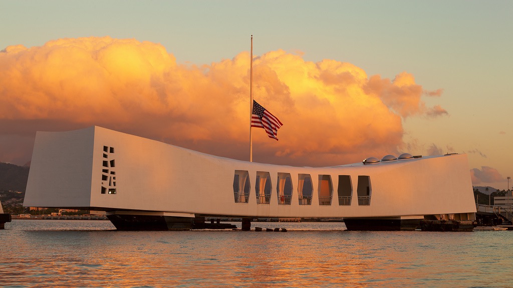 Painting of the USS Arizona Memorial at sunset with an American flag.