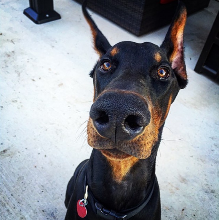 Painting of a Doberman Pinscher with large ears and prominent nose.