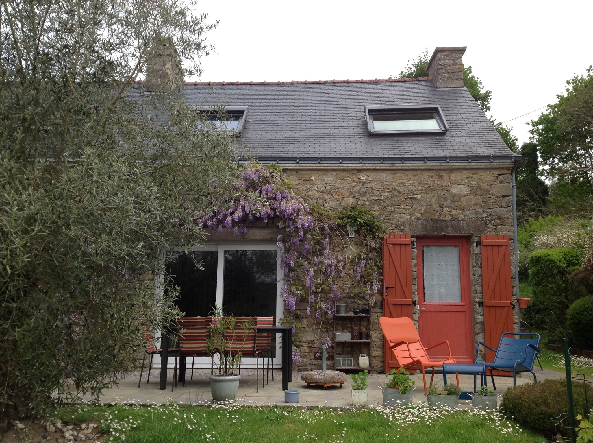 Stone house with red door, patio furniture, and wisteria.