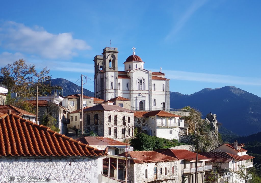 Painting of a white church in a town with red-tiled roofs and mountains in the background.
