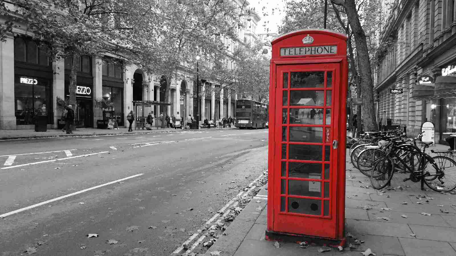 Red telephone booth on a grey street scene.