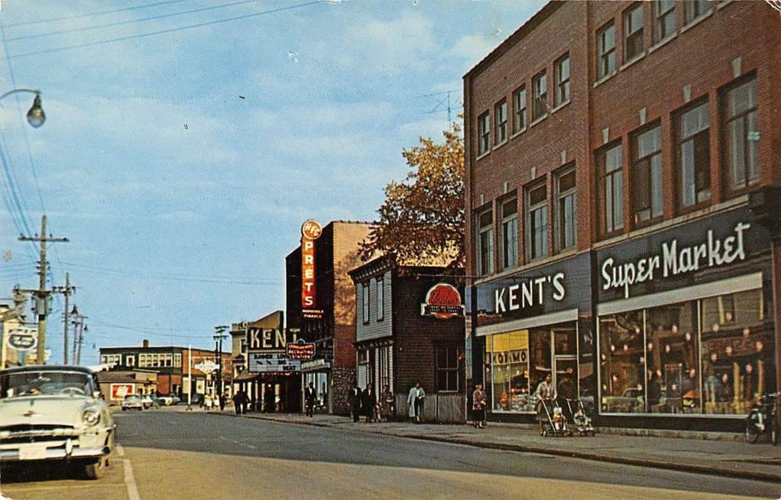Painting of a vintage street scene with shops and pedestrians, including a prominent W.J. Kent sign.