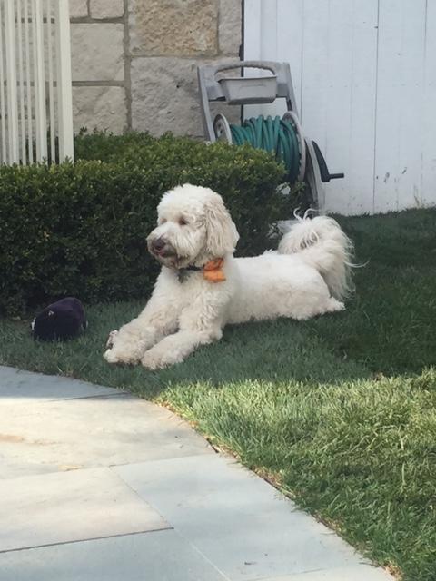 Painting of a fluffy white dog by a swimming pool