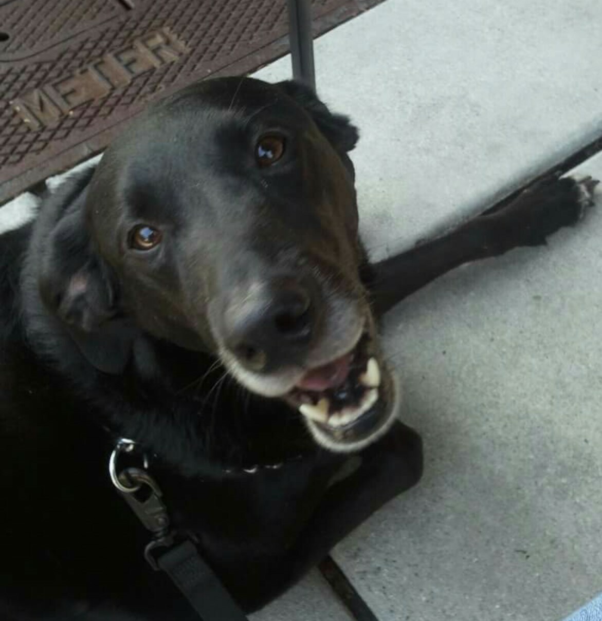 Painting of a smiling black dog looking up