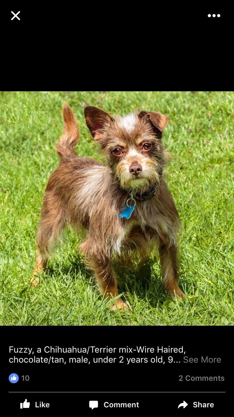 Painting of a brown, small dog standing in green grass wearing a collar with a blue tag.