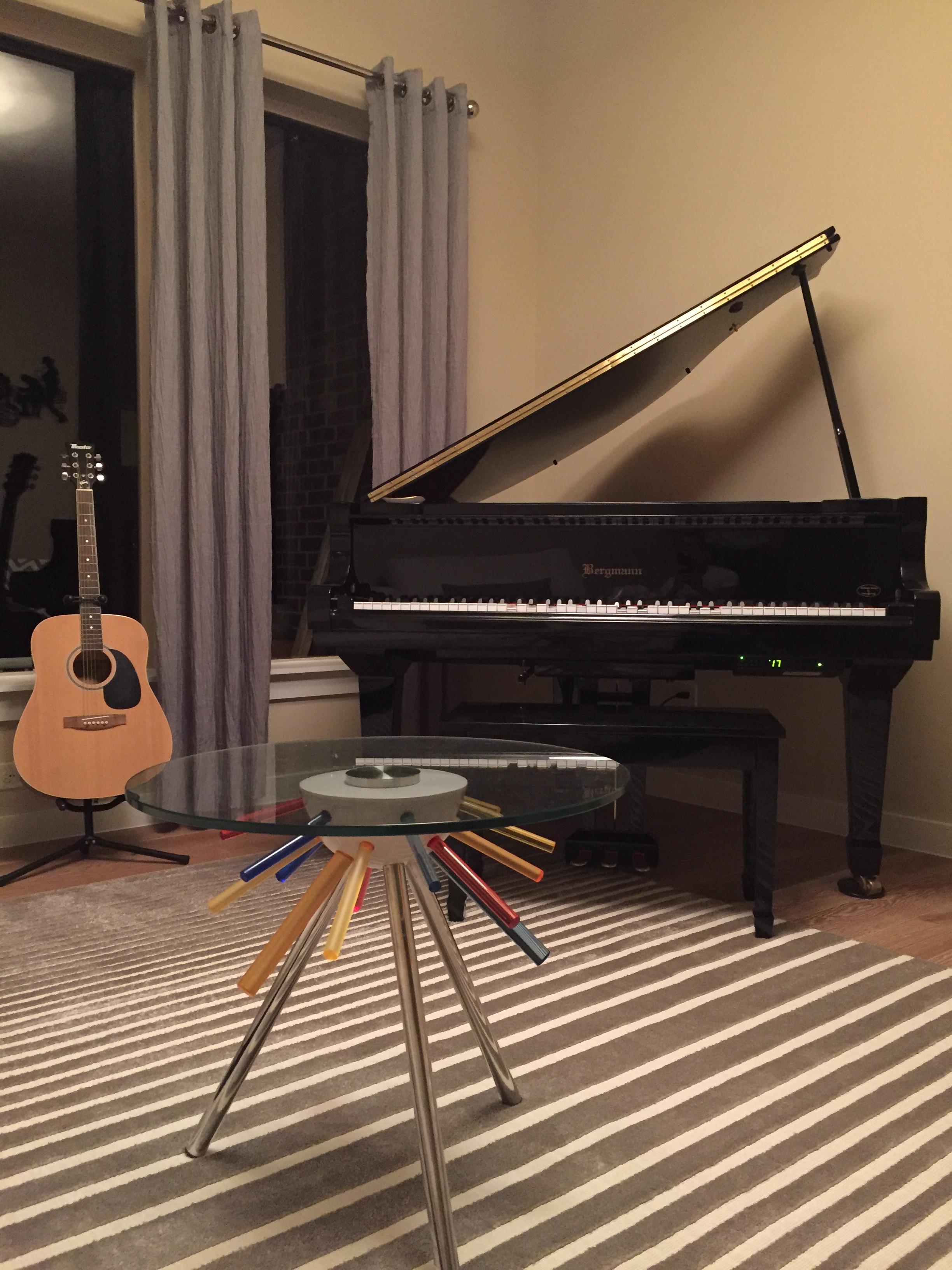 Painting of a room with a grand piano, guitar, and glass coffee table with colorful objects.