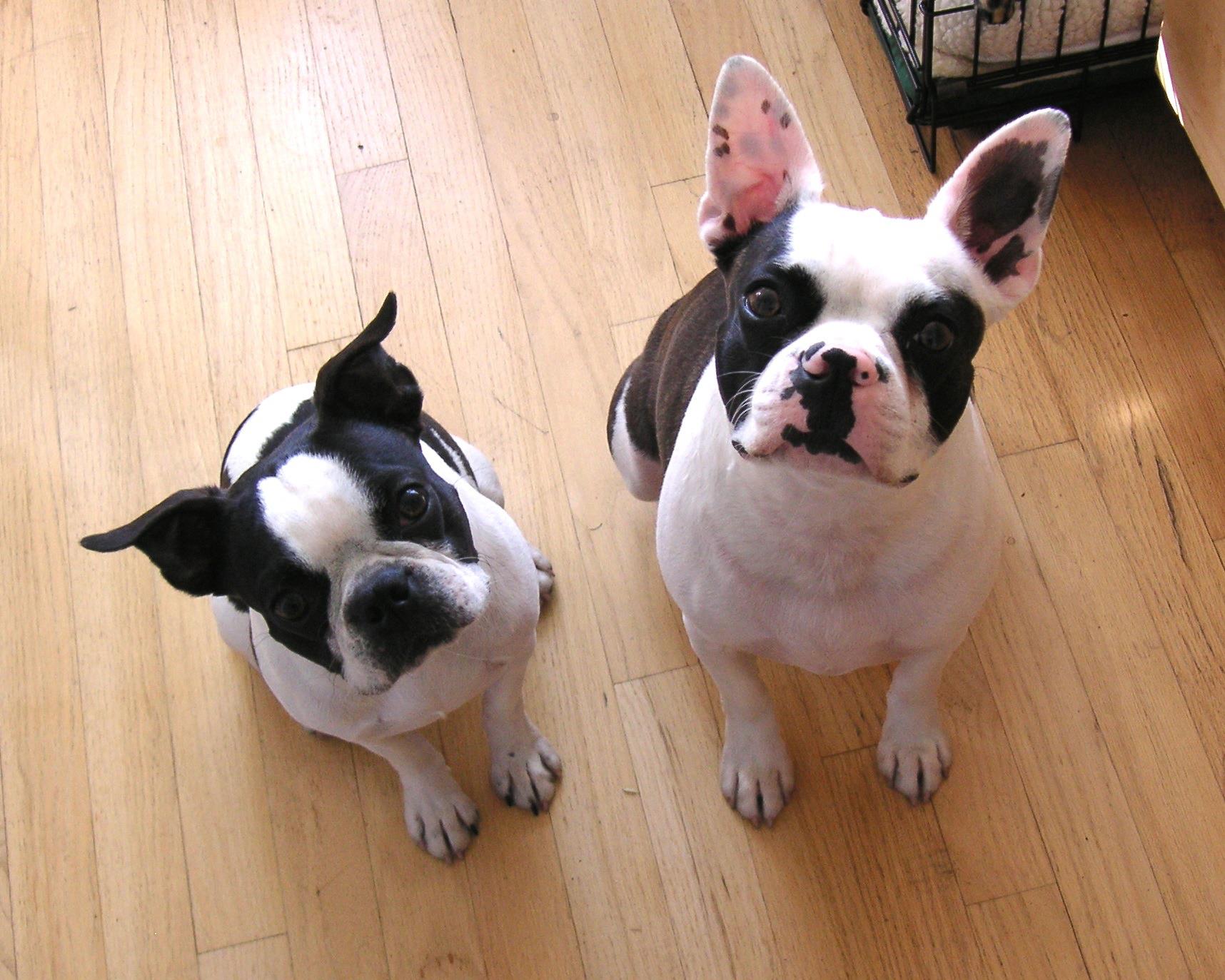 Two Boston Terriers sitting on a wood floor looking up.