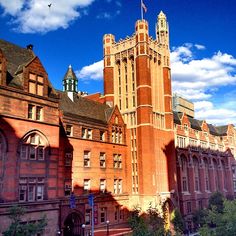 Watercolor painting of a red brick university building with a tall tower and American flag.
