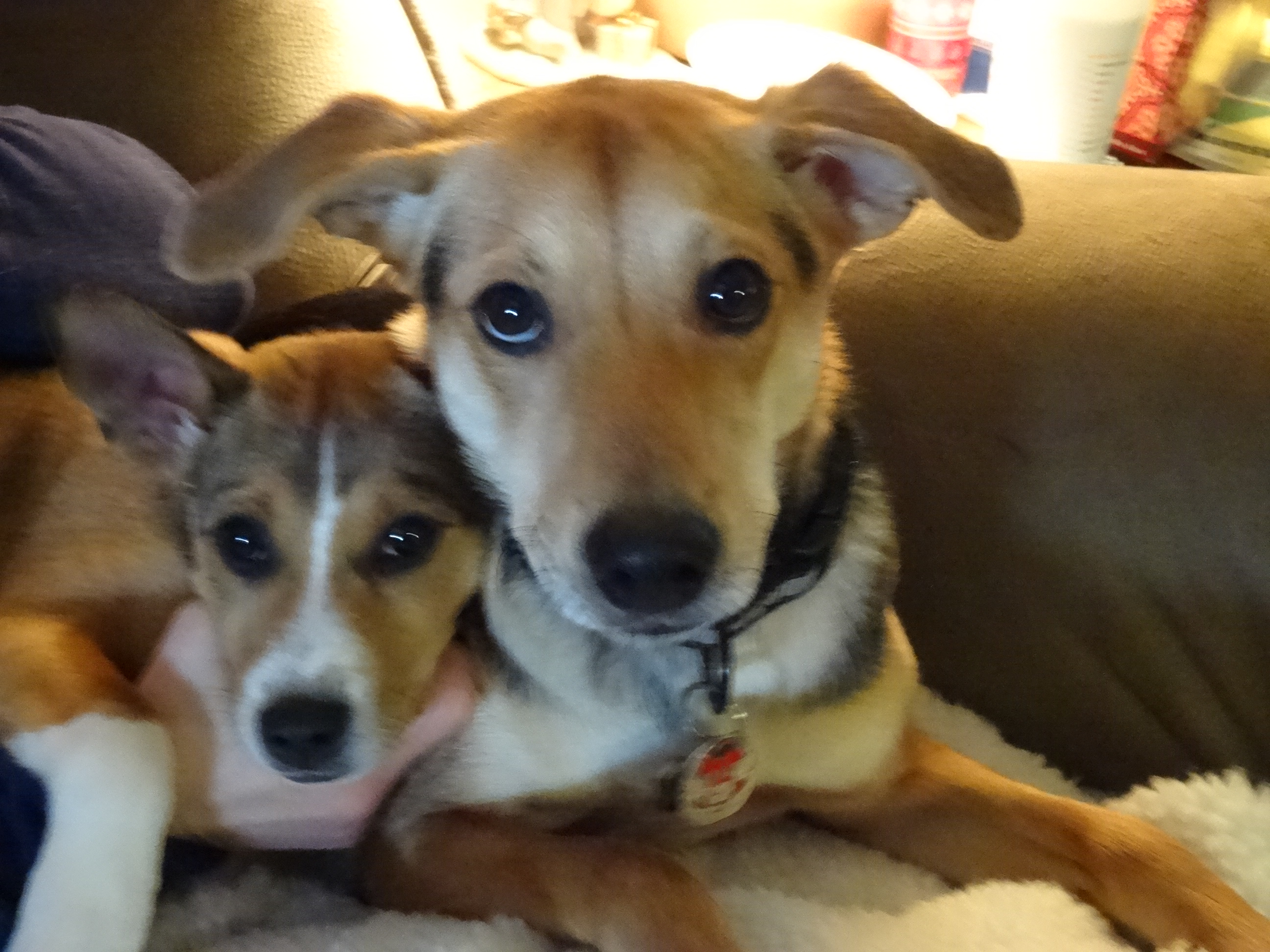 Portrait of two dogs cuddling on grass.
