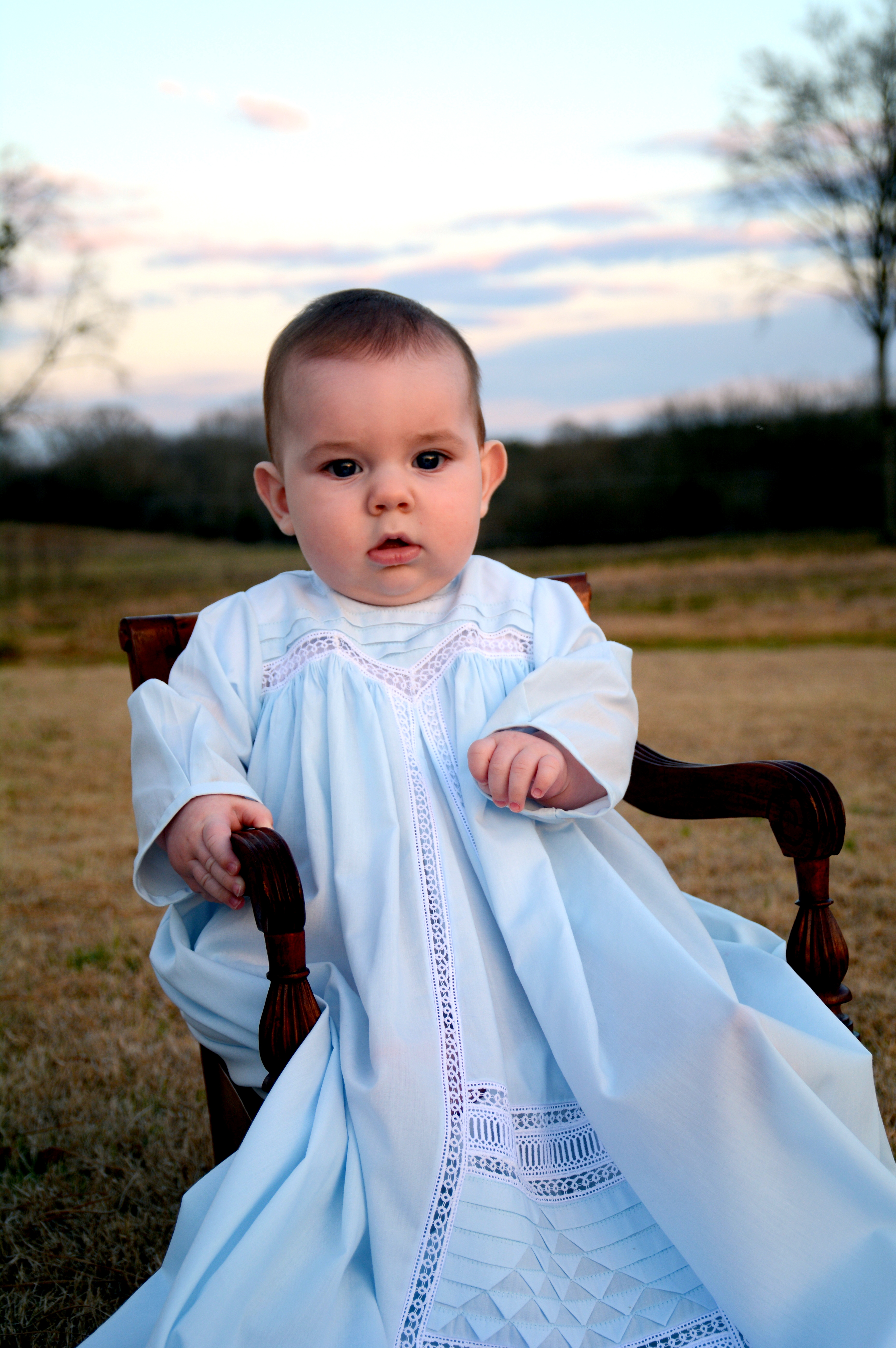 Oil painting of baby in blue dress sitting in a chair outdoors