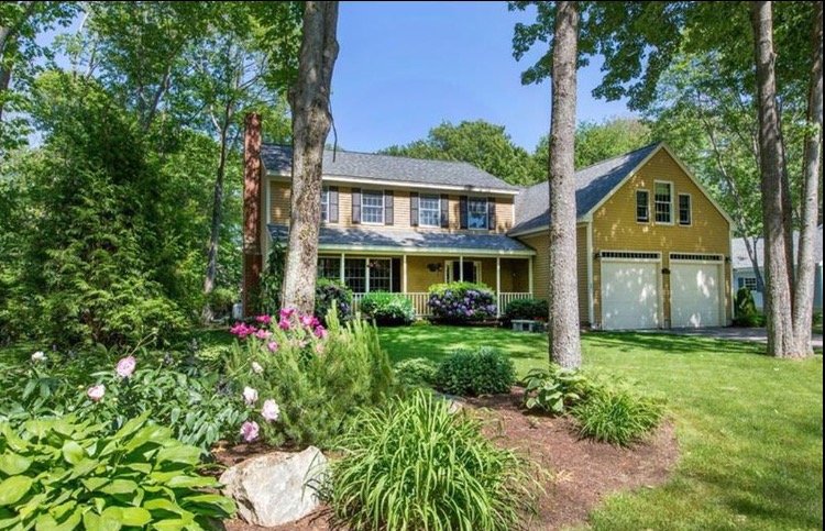 Painting of a yellow two-story house with a large yard and attached garage.